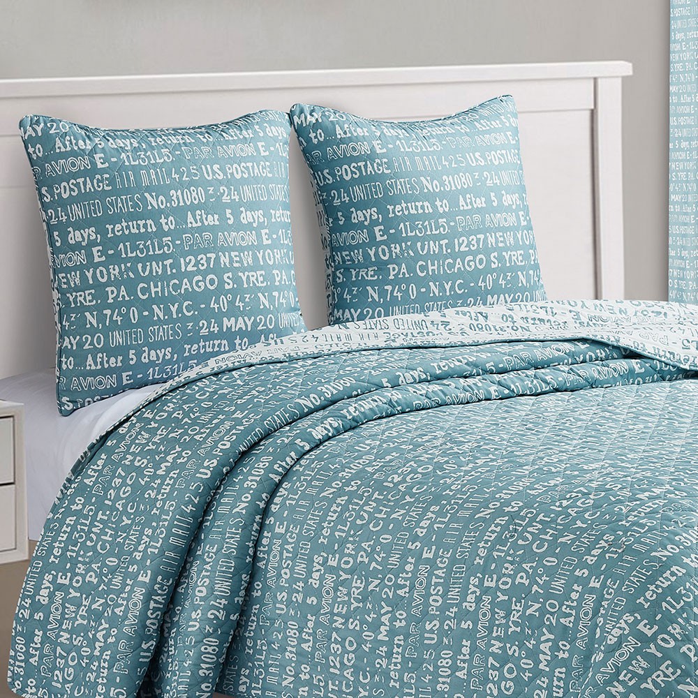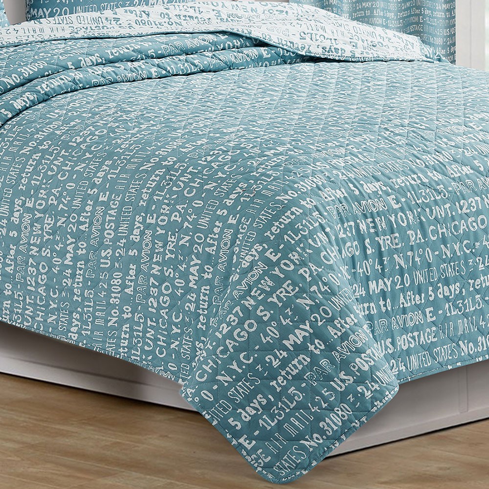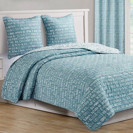 Colcha bouti Secret verde azulado con diseño sencillo y original de estampado de letras y números con estilo de pistas de detective en blanco sobre un fondo verde azulado, la cara trasera presenta el mismo estampado, pero con letras en verdes sobre un fondo blanco.