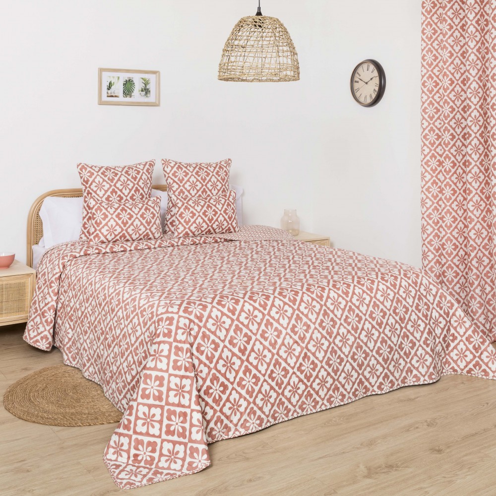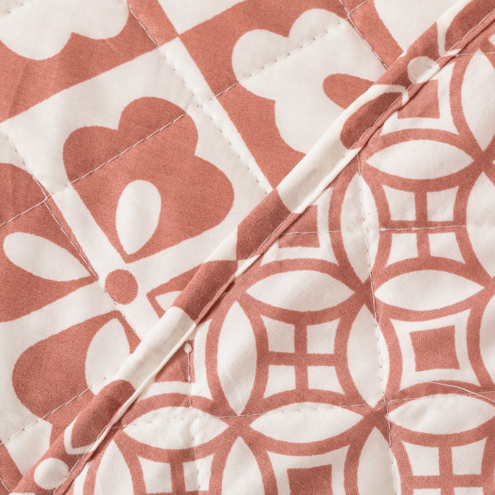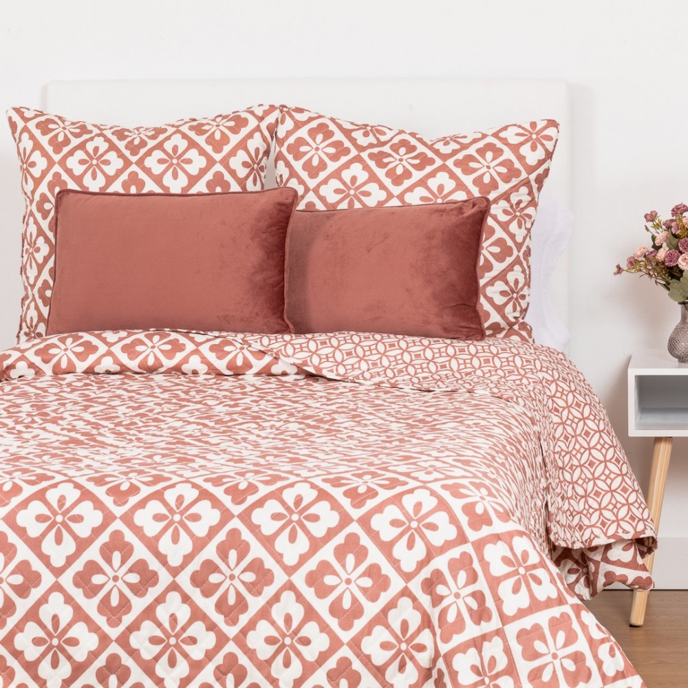 Colcha bouti Simona marsala de rombos y flores geométricas en tonos rosa marsala y blanco, la cara trasera presenta un estampado geométrico más discreto en los mismos colores.