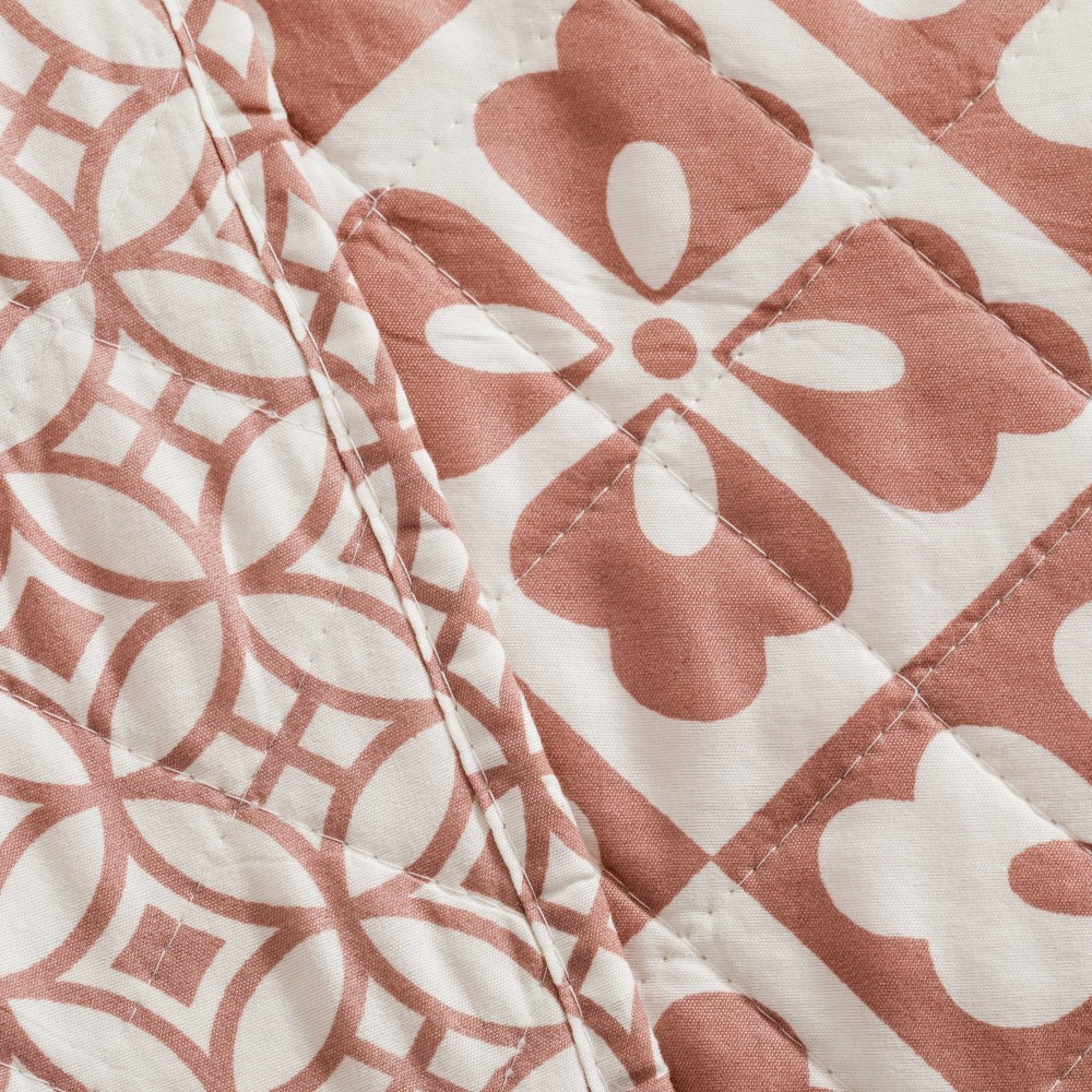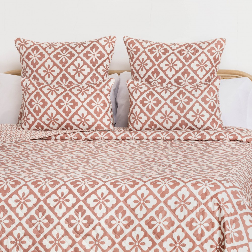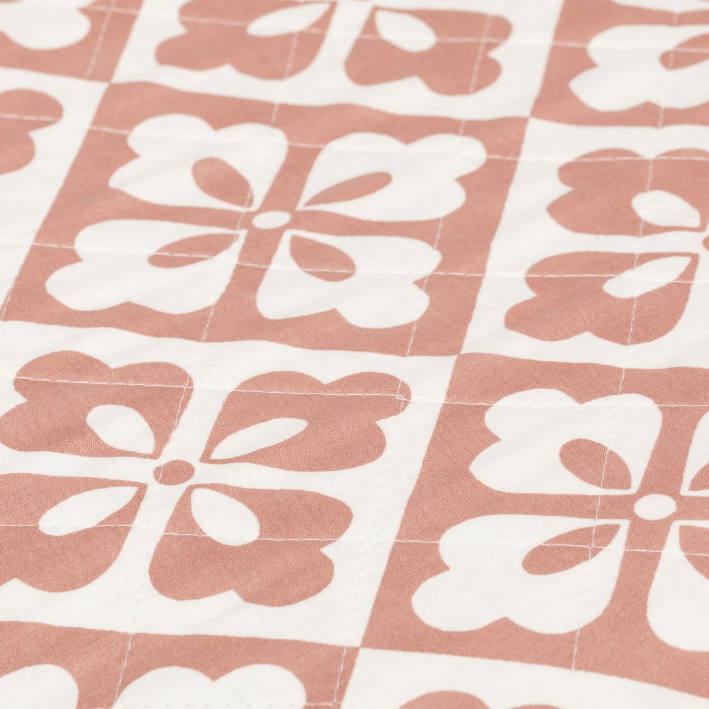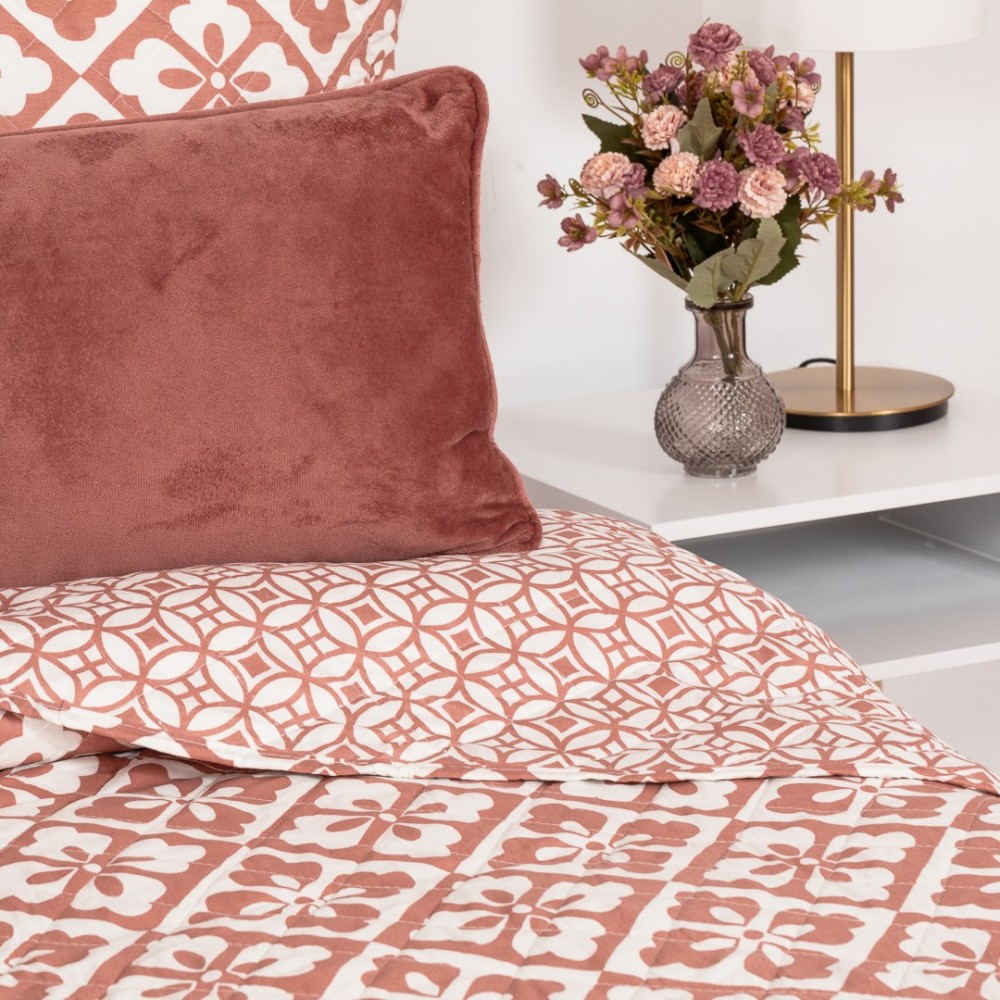 Colcha bouti Simona marsala de rombos y flores geométricas en tonos rosa marsala y blanco, la cara trasera presenta un estampado geométrico más discreto en los mismos colores.
