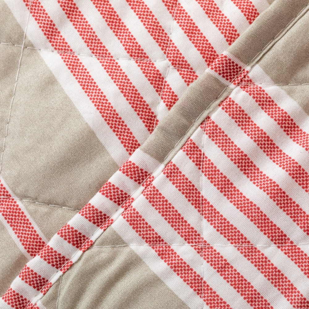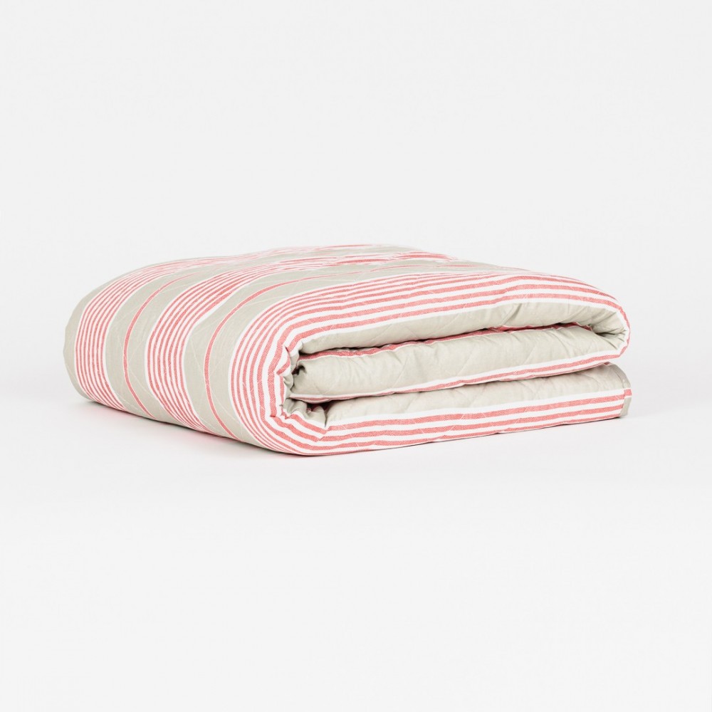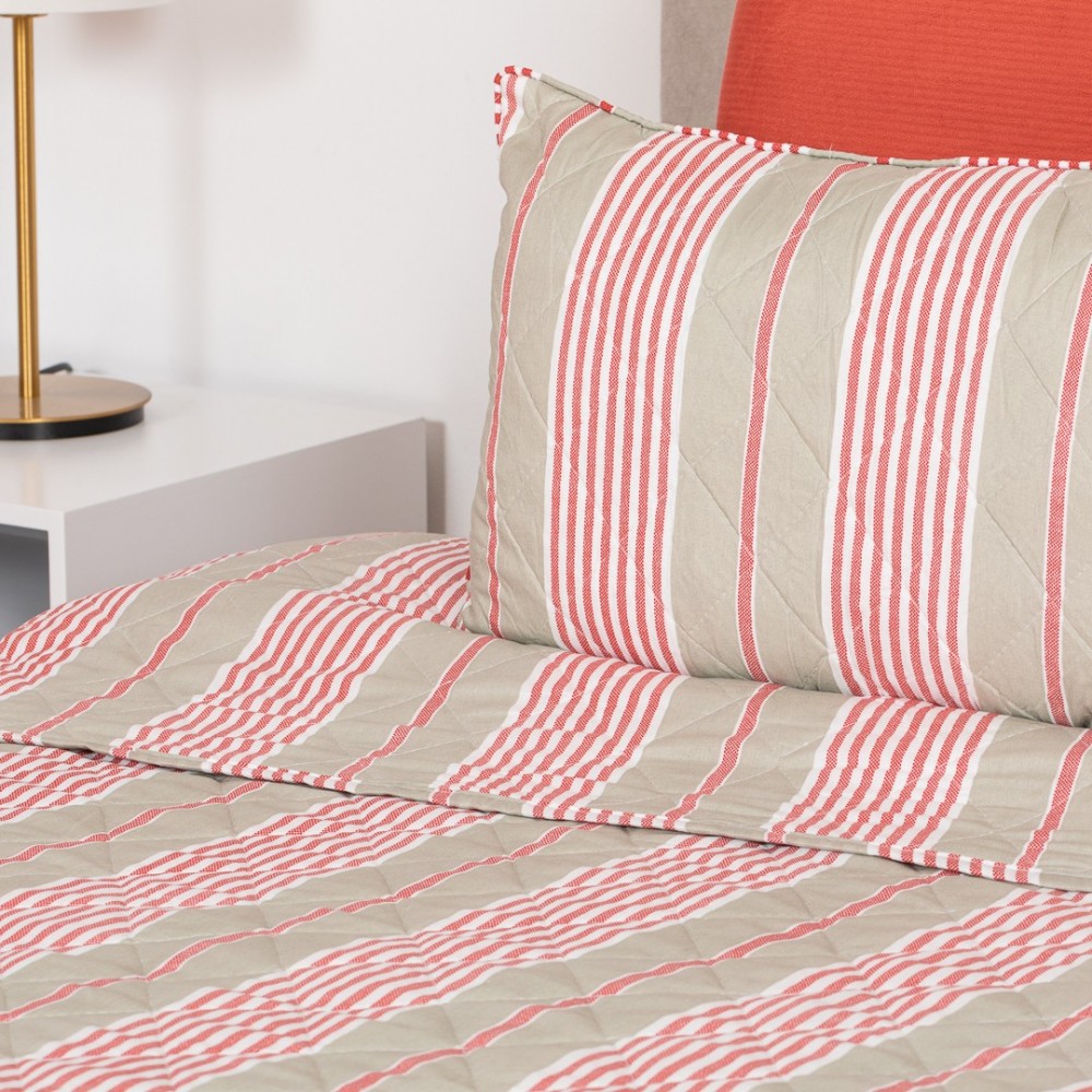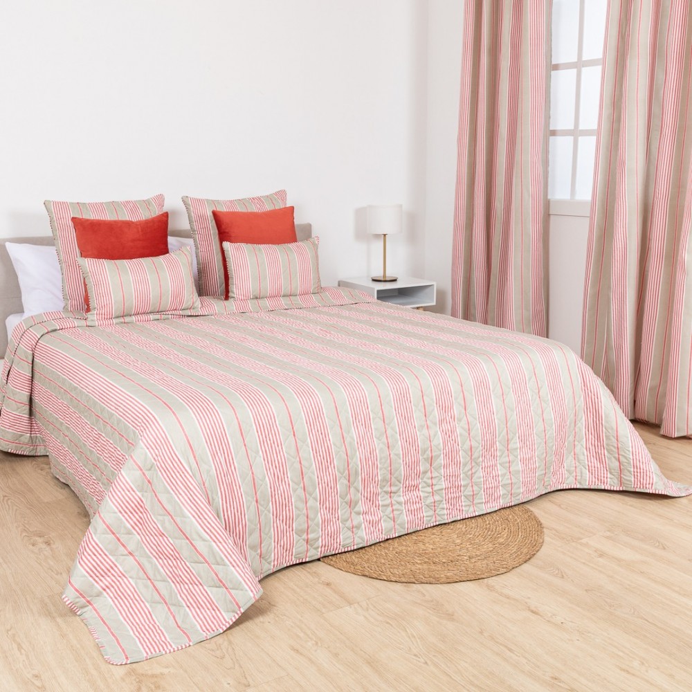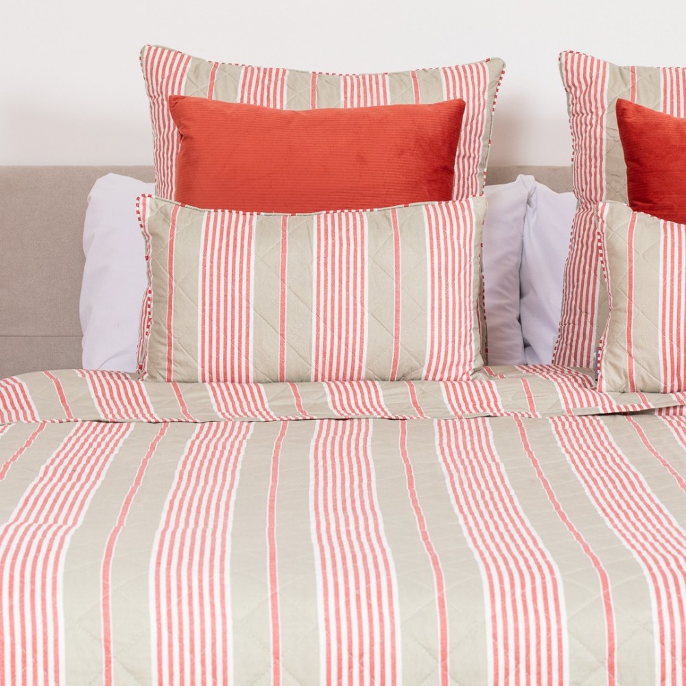 Colcha bouti Fede teja de finas rayas en tonos blanco y rojo sobre fondo arena, la cara trasera presenta el mismo diseño.