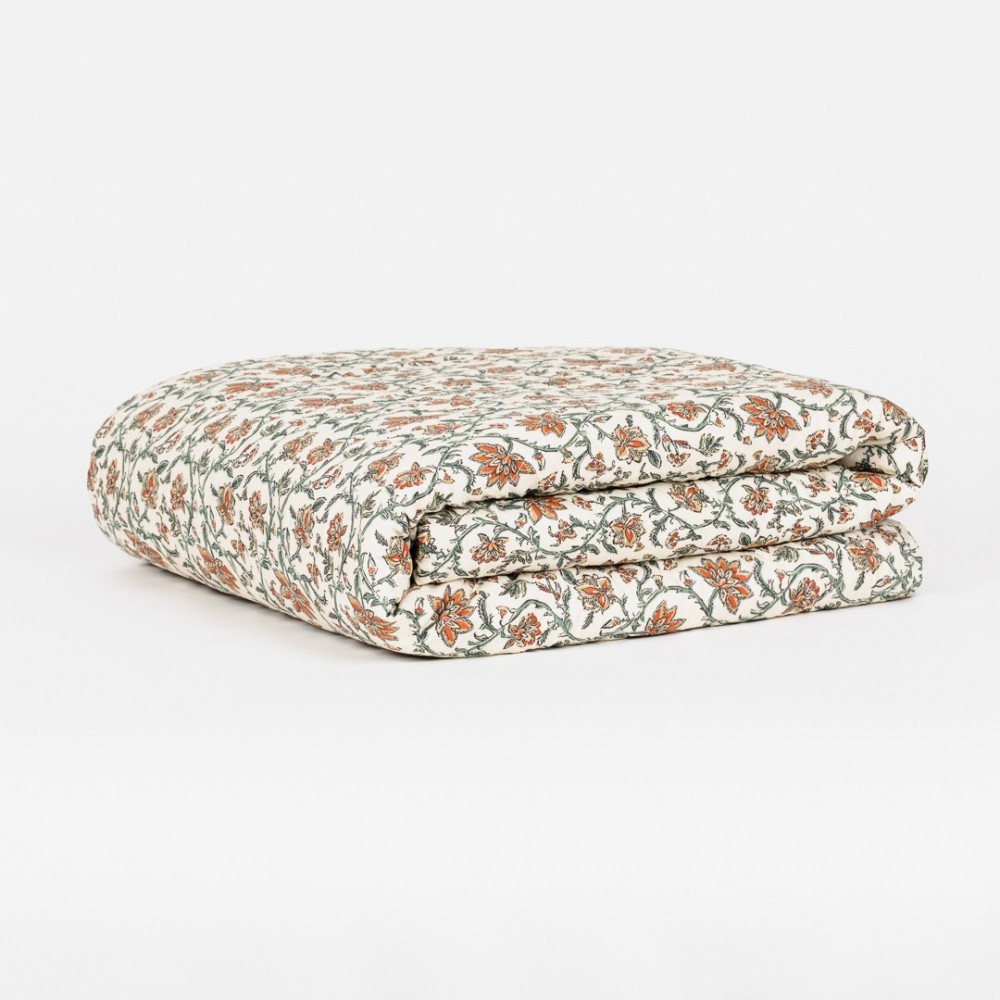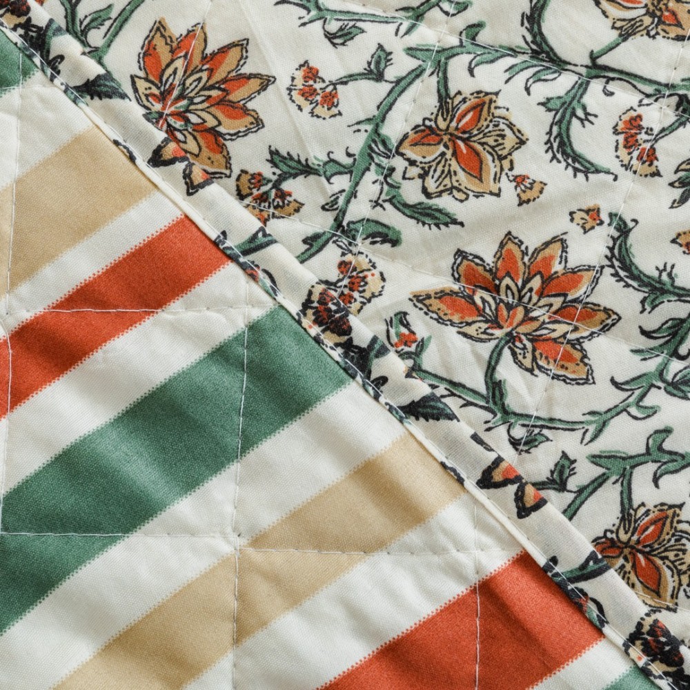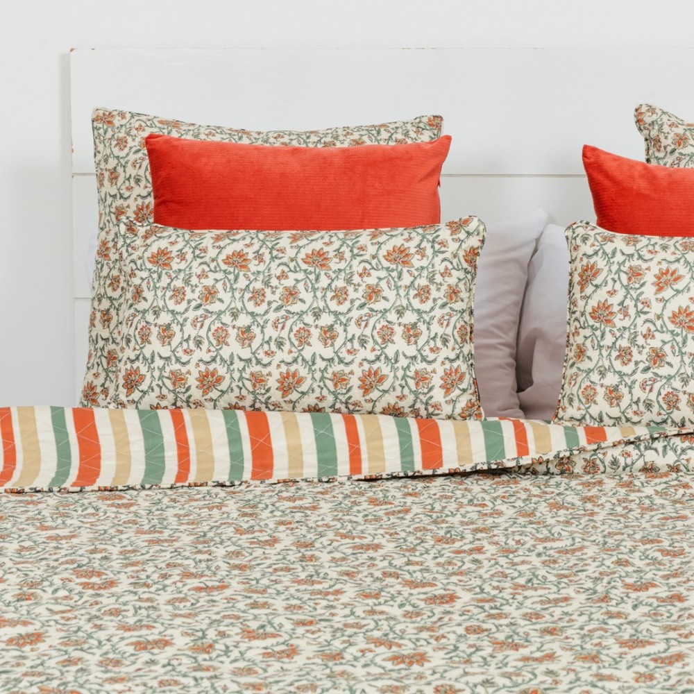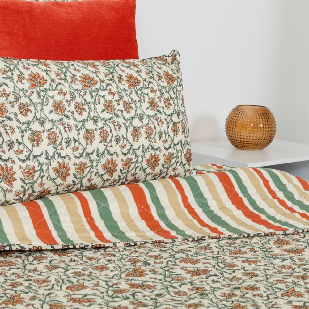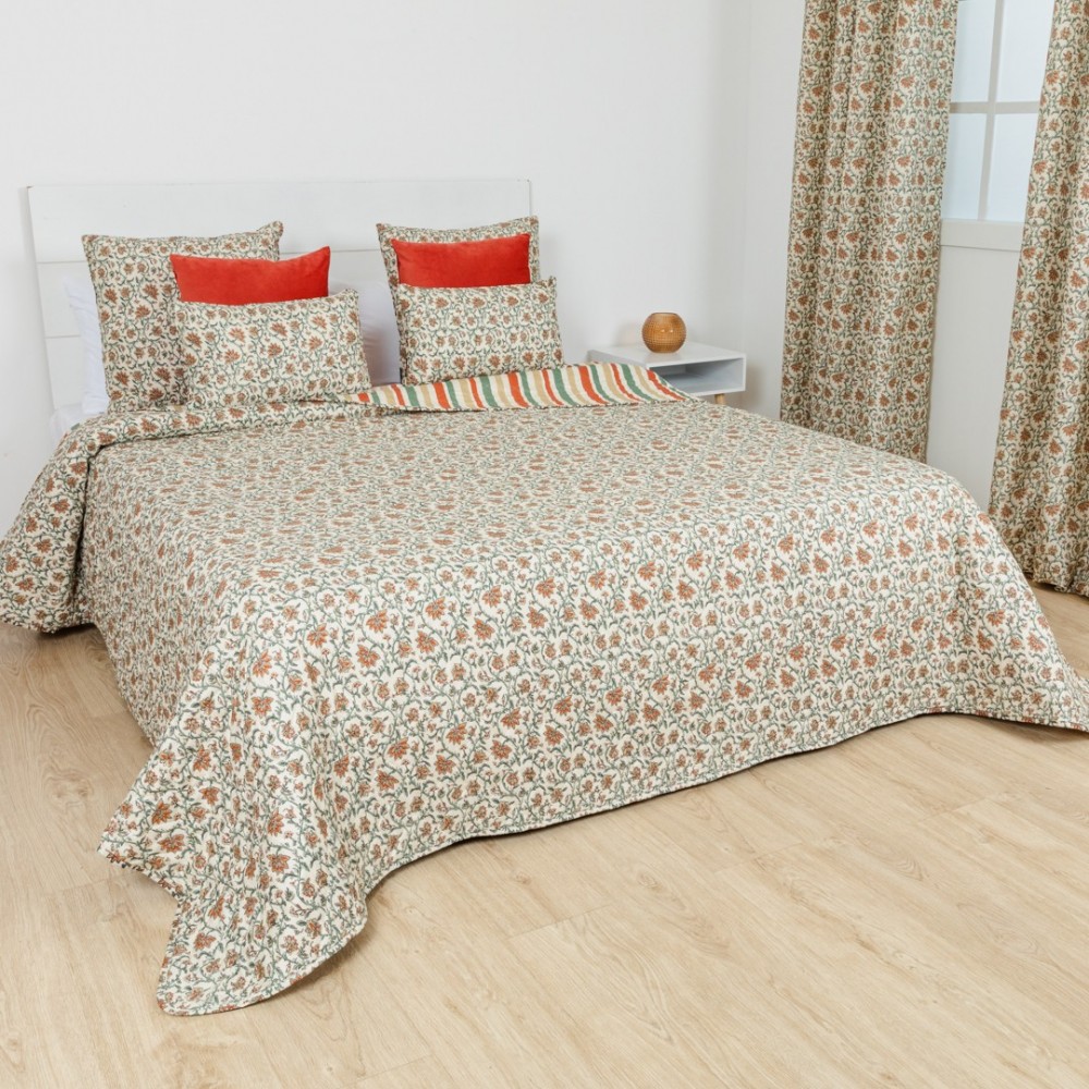 Colcha bouti Isabel teja con un estampado elegante de flores en tonos rojos, arena y verde sobre un fondo blanco natural, la cara trasera es de rayas en los mismos colores.