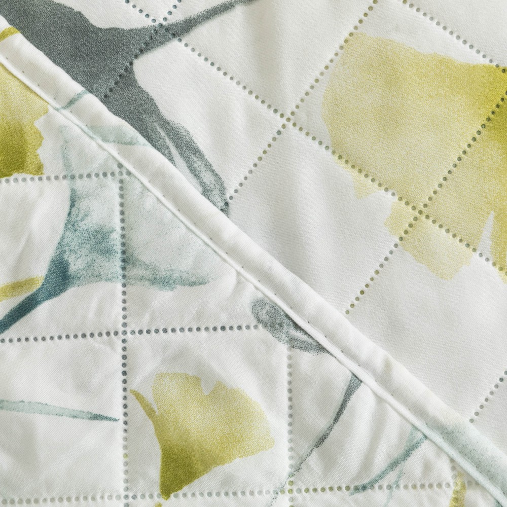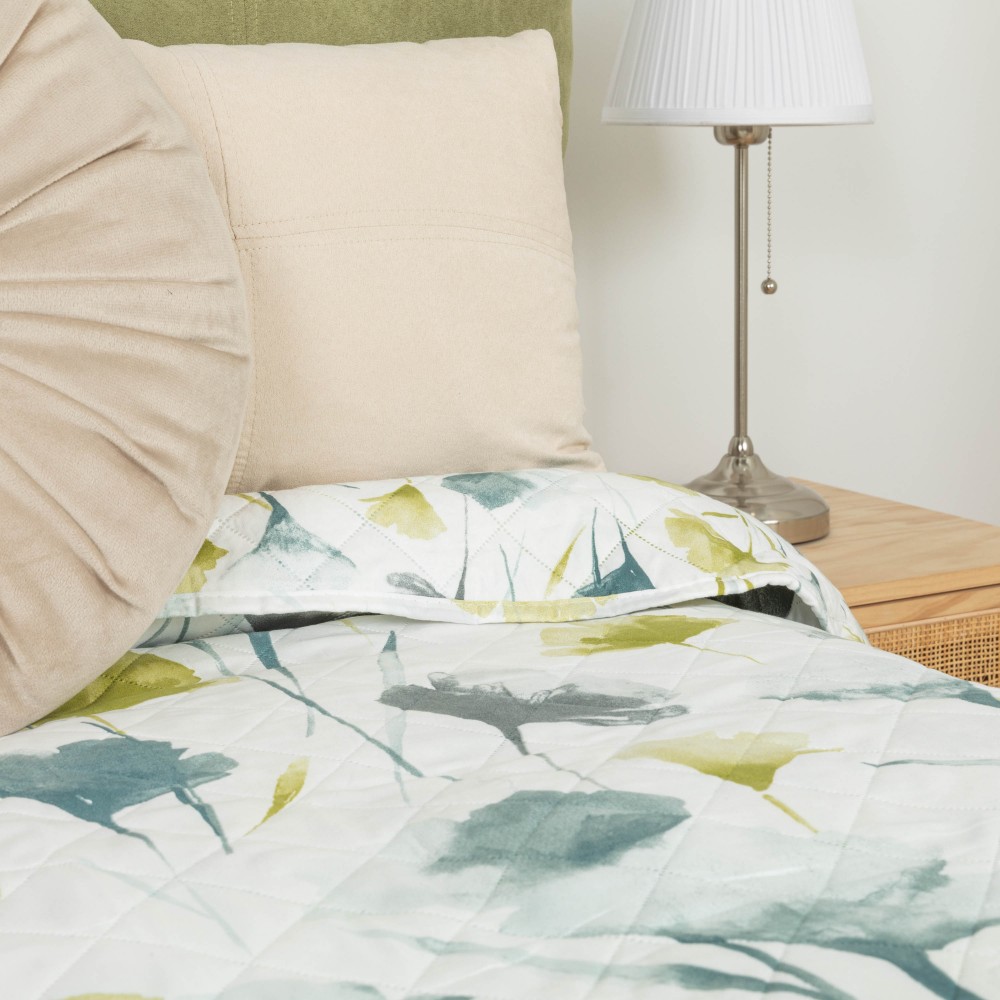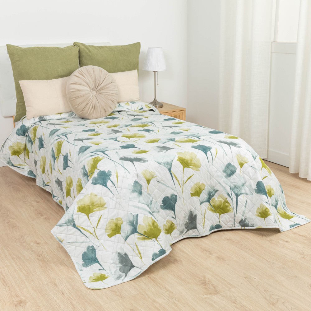 Colcha bouti Nina verde con estampado de grandes flores en tonos verdes y azules sobre un fondo blanco, la cara trasera presenta el mismo diseño.