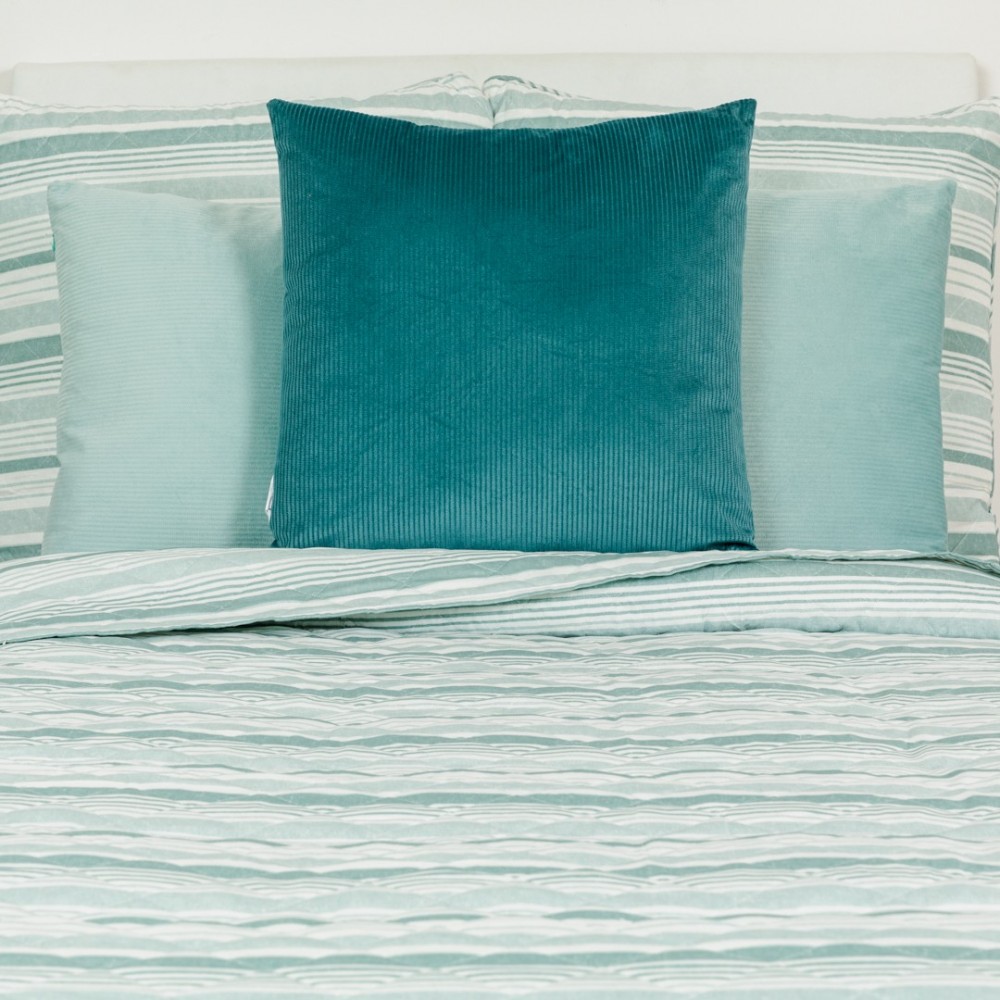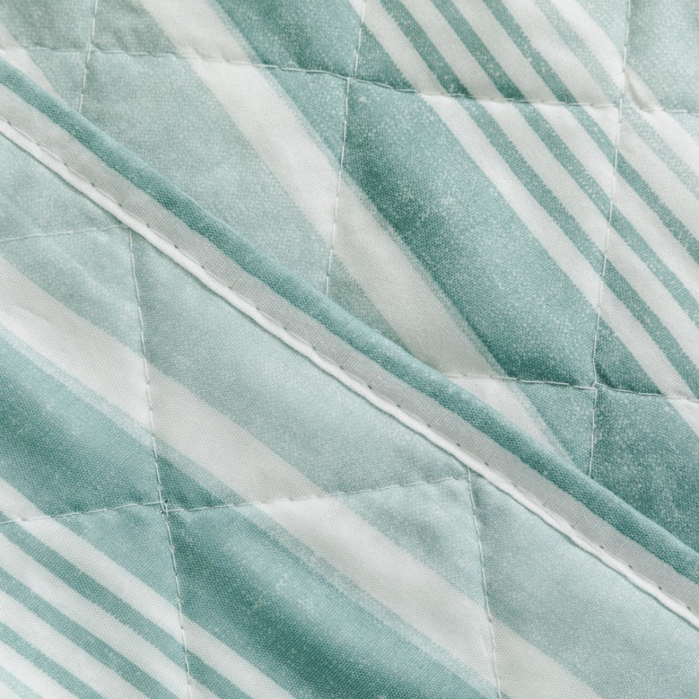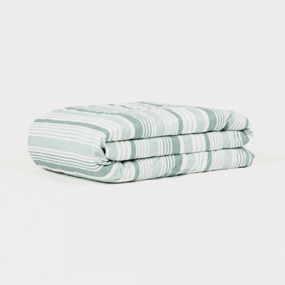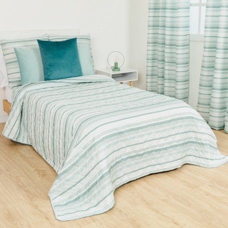 Colcha bouti Raya Bonnie verde francés con estampado sencillo de rayas verdes y blancas, la cara trasera presenta el mismo diseño.