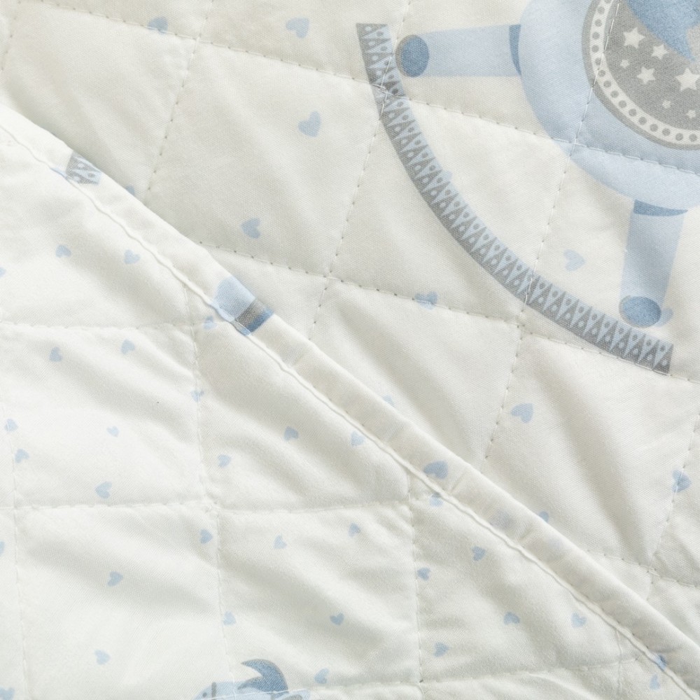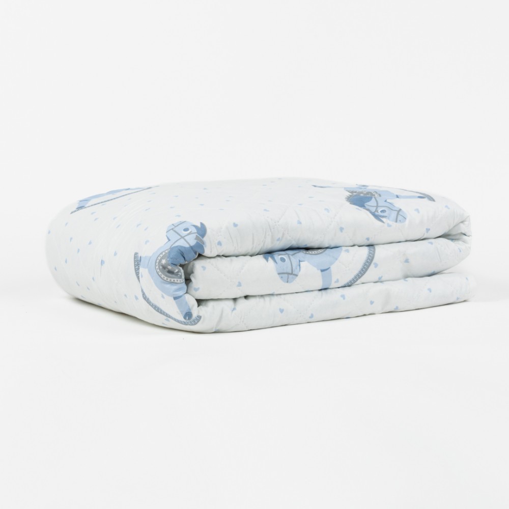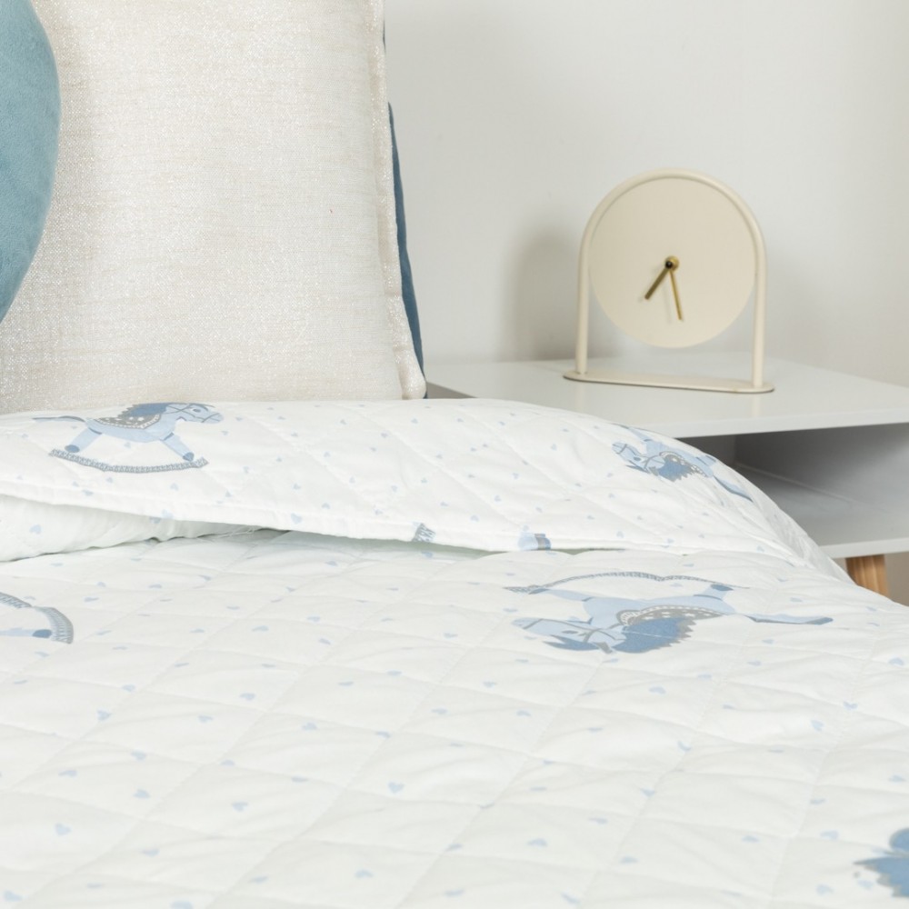 Colcha bouti modelo Caballitos celeste con diseño juvenil de caballitos azules con detalles de pequeños corazones del mismo color sobre un fondo blanco, la cara trasera presenta el mismo estampado.