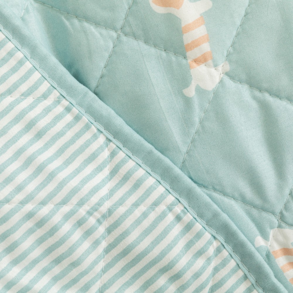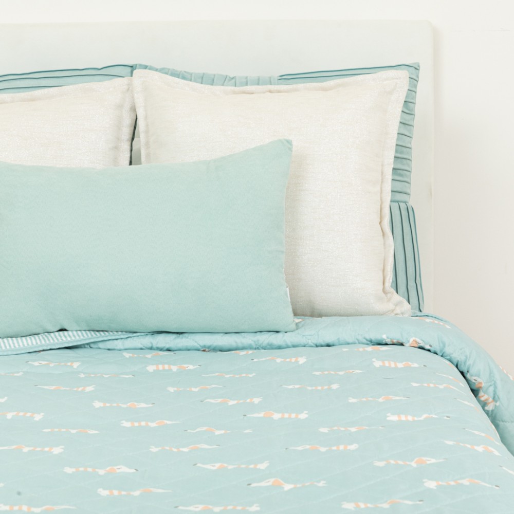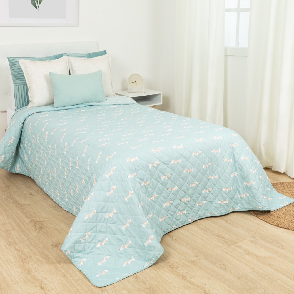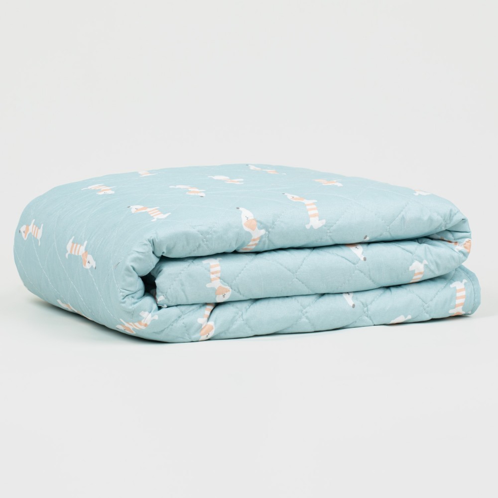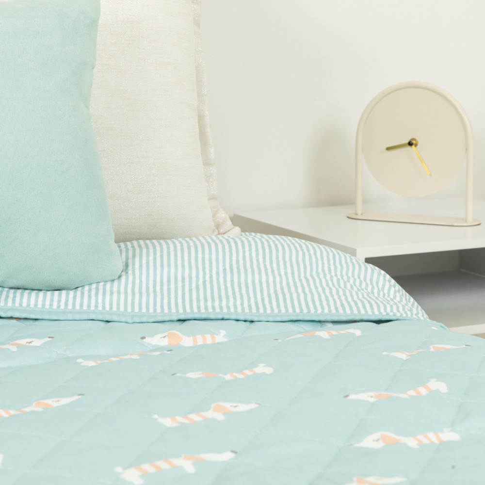 Colcha bouti modelo Ponder verde azulado con estampado juvenil de pequeños perritos en tonos blanco y arena sobre un fondo verde azulado, la cara trasera es de rayas azules y blancas.