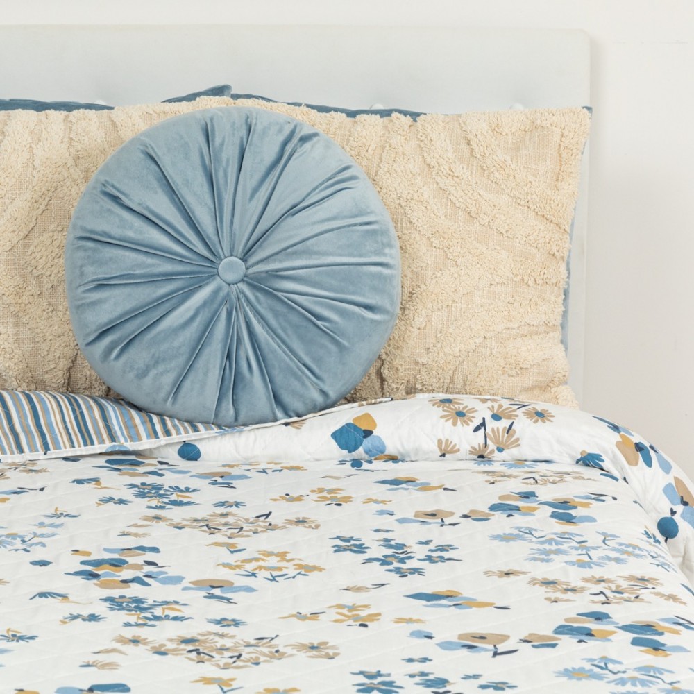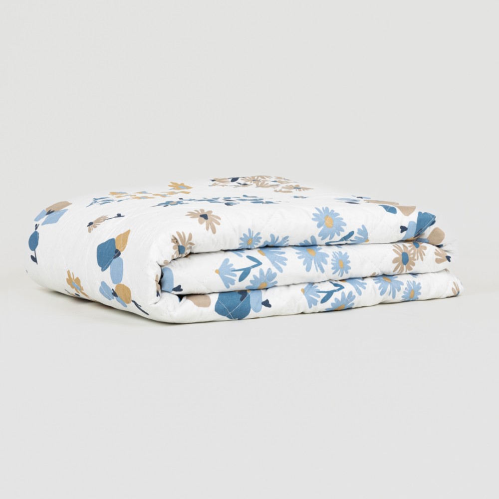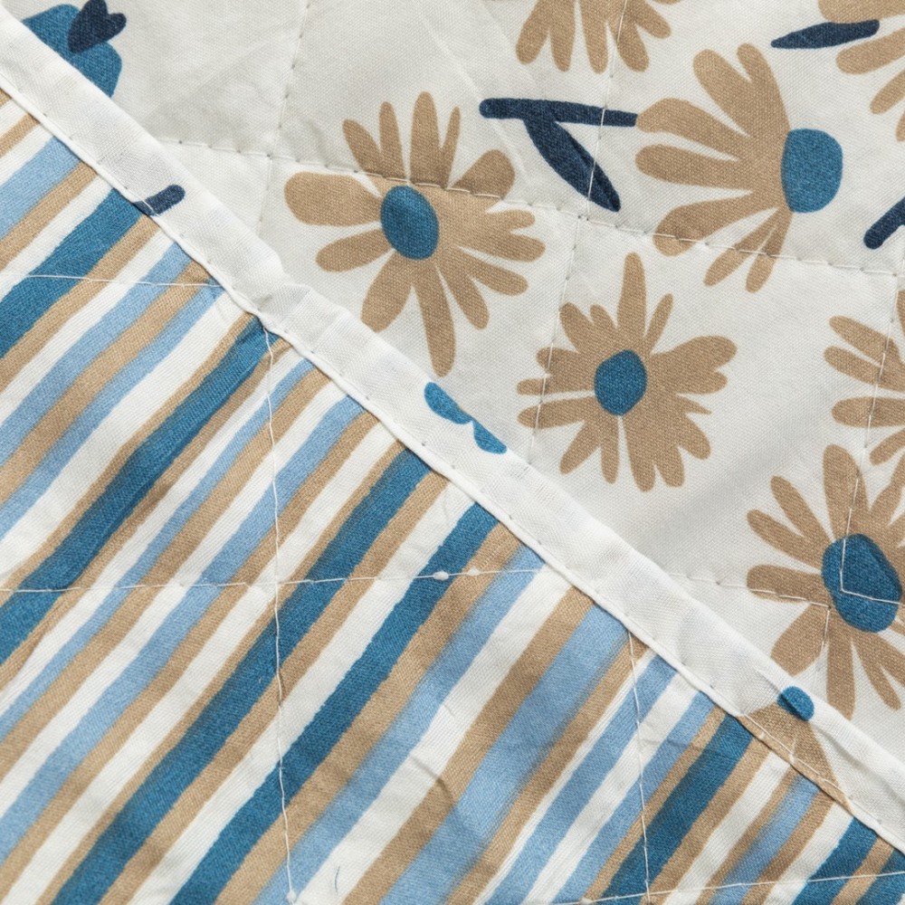 Colcha bouti modelo Arauz índigo estampada con diferentes flores en tonos azules y arena sobre un fondo blanco, la cara trasera es de rayas en los mismos colores.