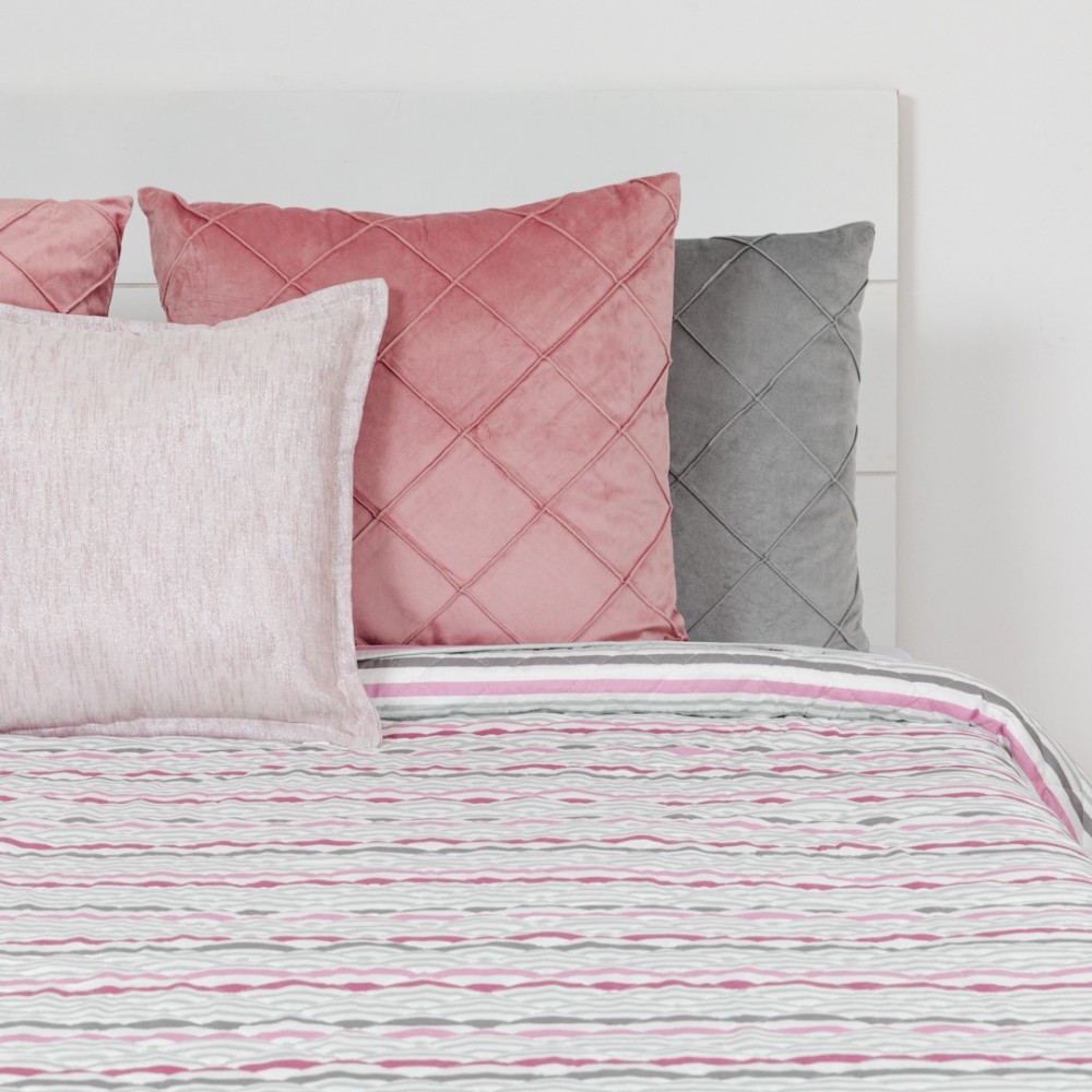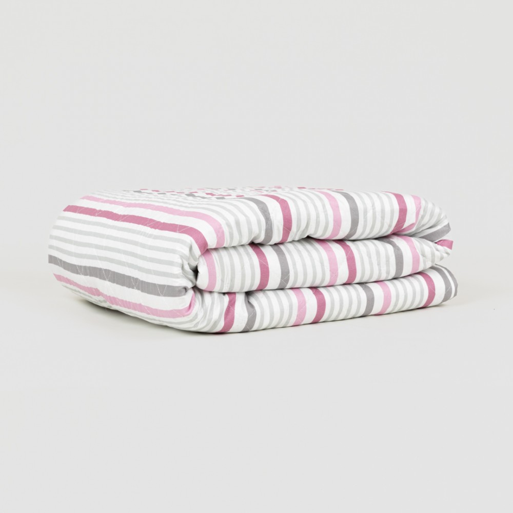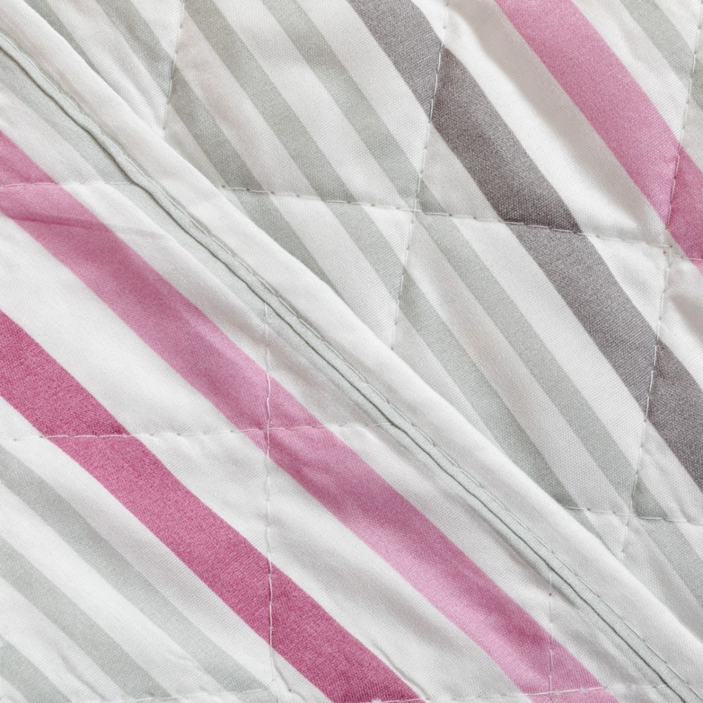 Colcha bouti modelo Raya Recadero malva con un diseño clásico de rayas en tonos malvas y grises sobre un fondo blanco, la cara trasera presenta el mismo estampado.
