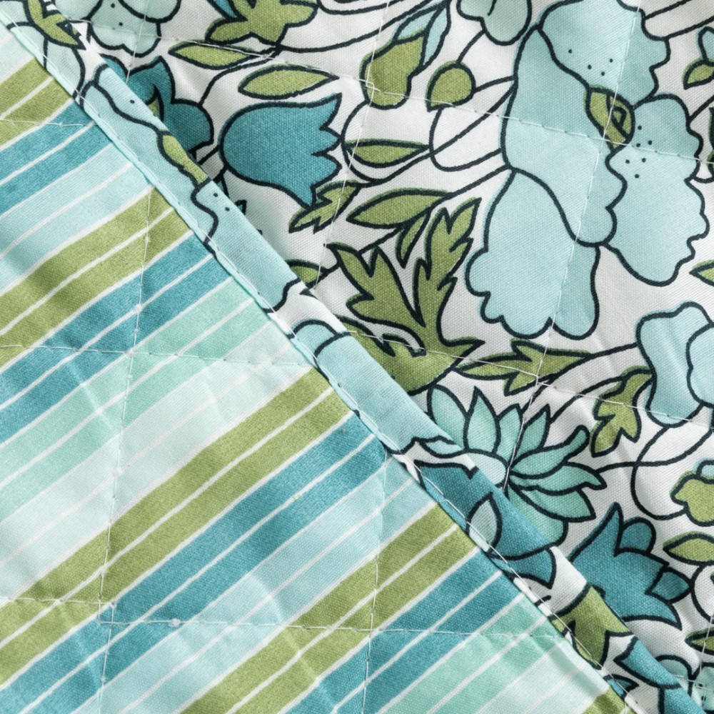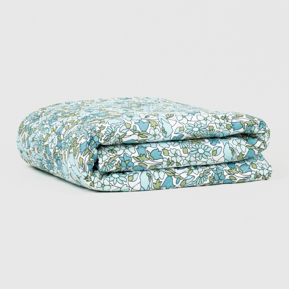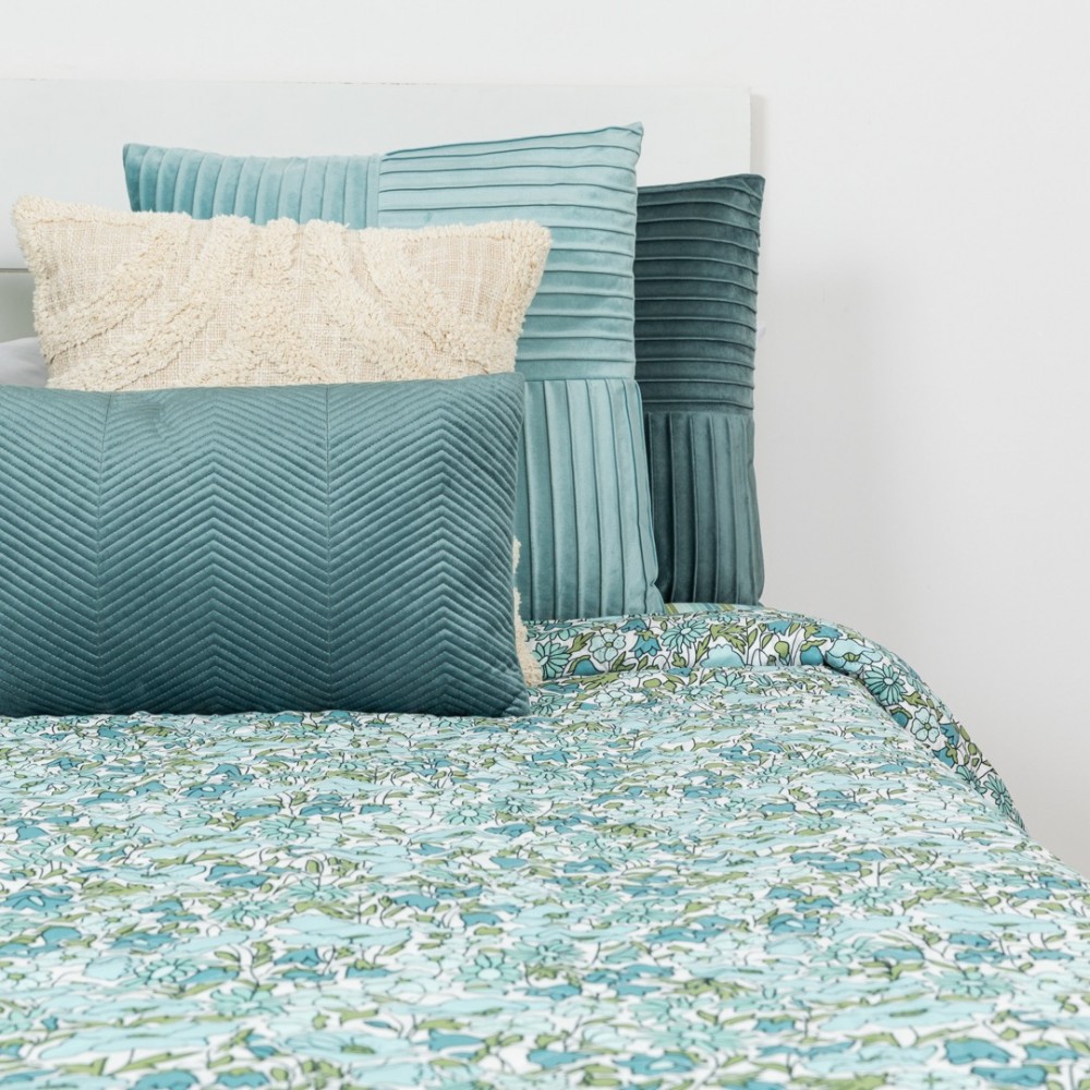 Colcha bouti modelo Taylor indigo con un estampado de diferentes flores y hojas en tonos azules y verdes sobre un fondo blanco, la cara trasera es de rayas en los mismos colores.