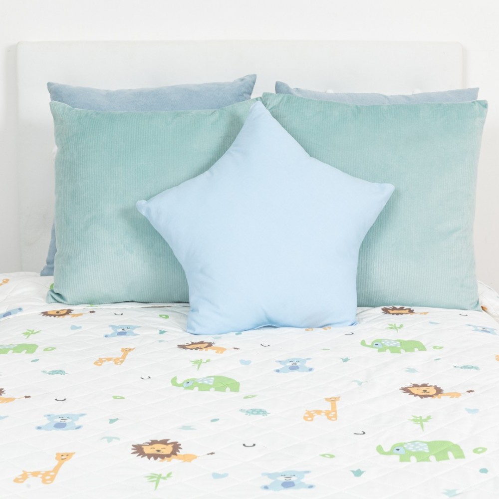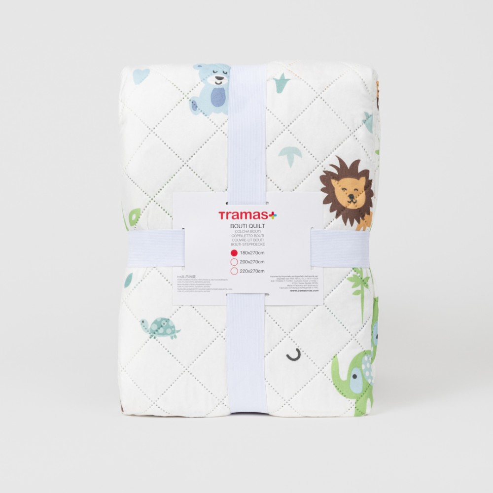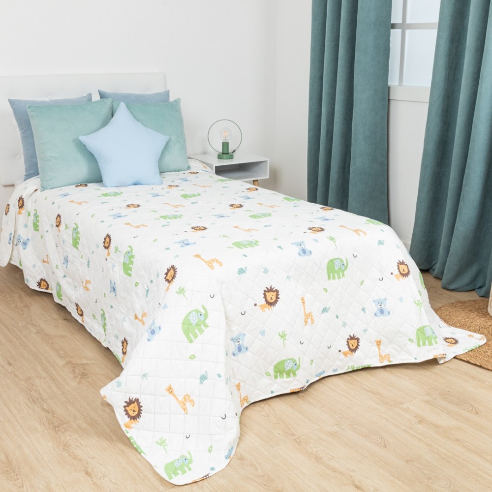 Colcha bouti Animales con diseño juvenil de diferentes animales como leones, jirafas, ositos y elefantes sobre fondo blanco con algunos detalles de pequeñas plantas y hojas verdes, la cara trasera presenta el mismo diseño.