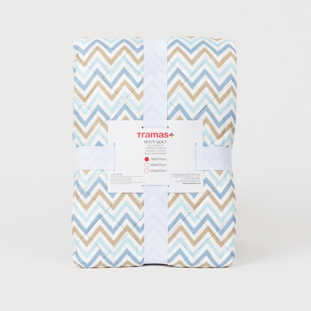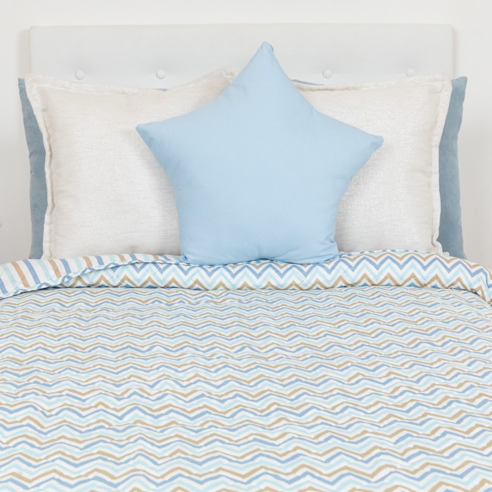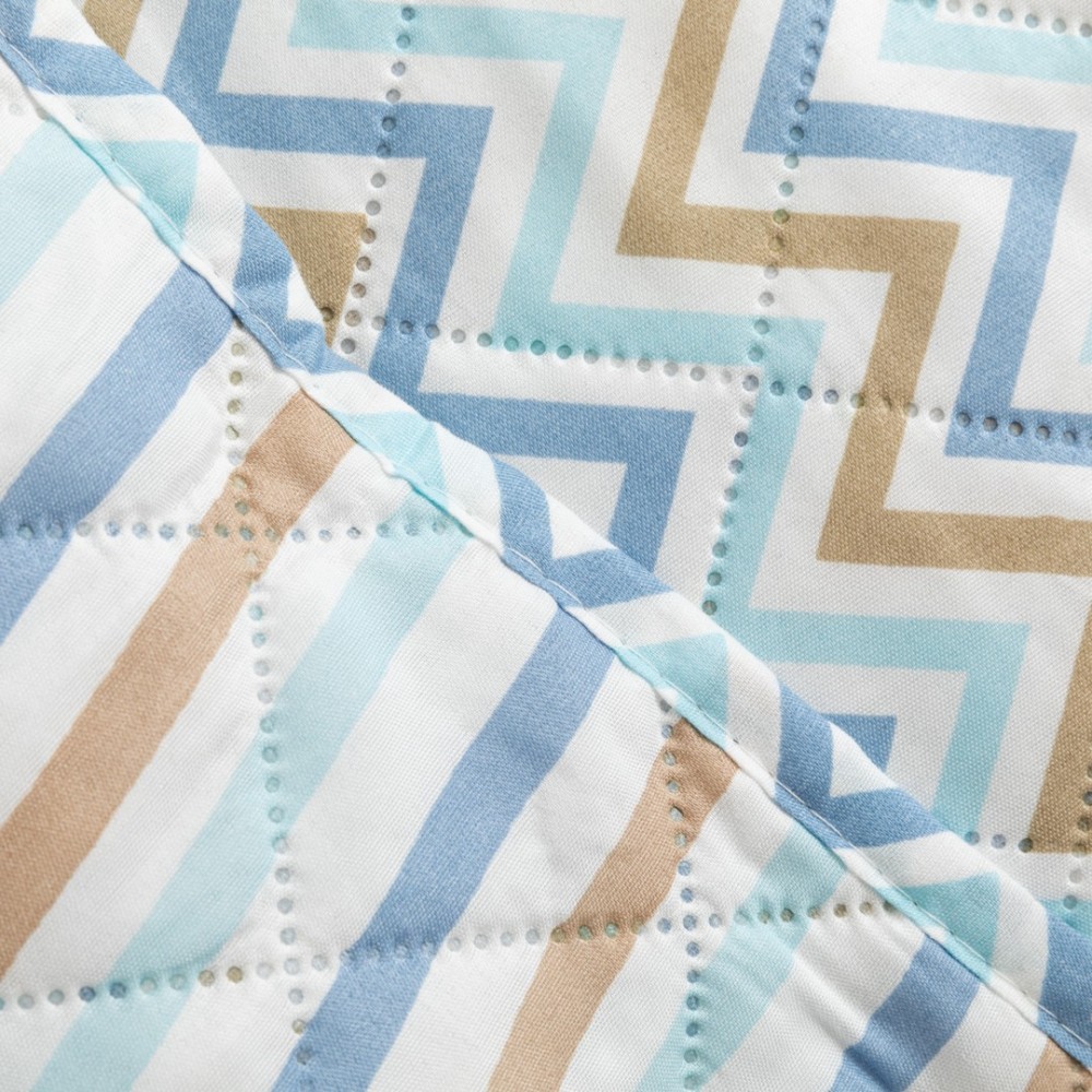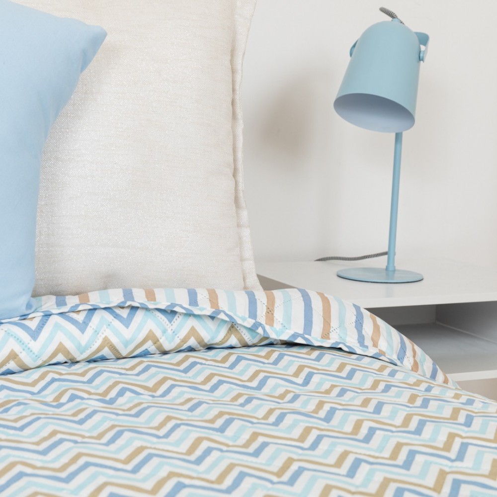 Colcha bouti Raya Peluche celeste con estampado sencillo de zigzags en tonos azules y arena sobre un fondo blanco, la cara trasera es de rayas en las mismas tonalidades.