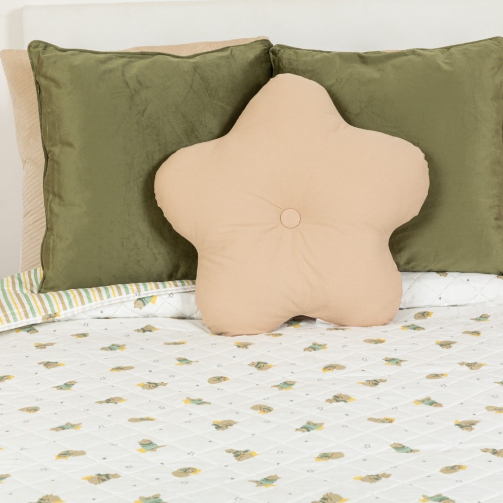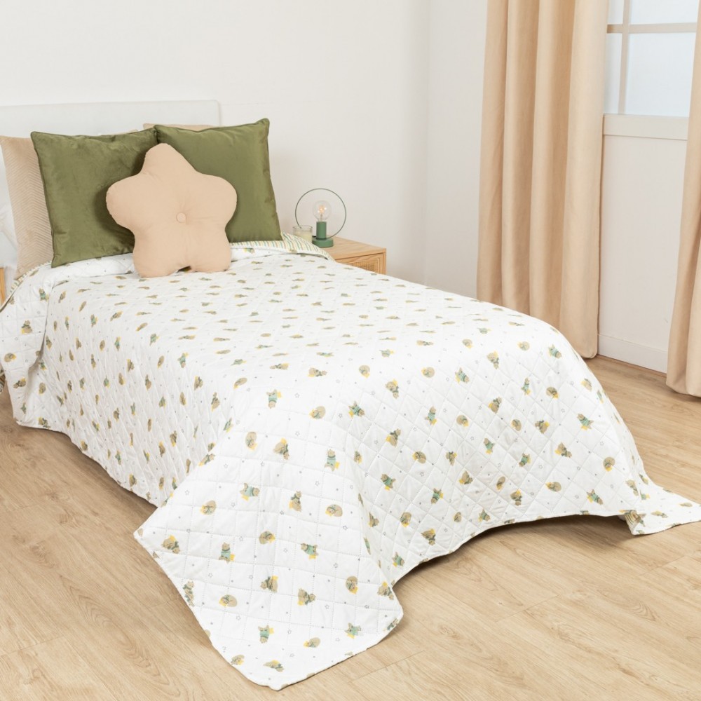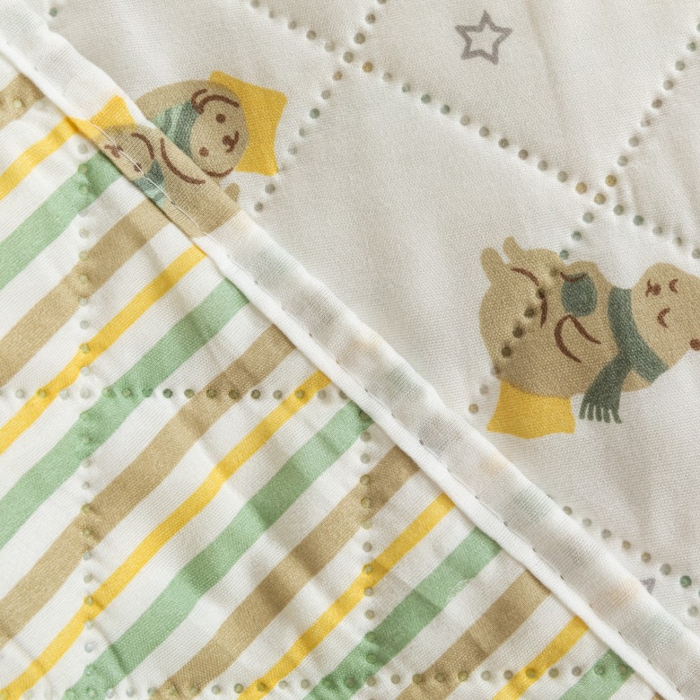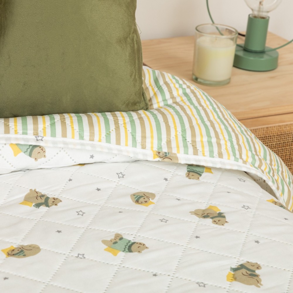 Presenta un estampado infantil de pequeños ositos y estrellas sobre un fondo blanco, la cara trasera es de rayas en diferentes tonos verdes, beige y amarillo sobre fondo blanco.