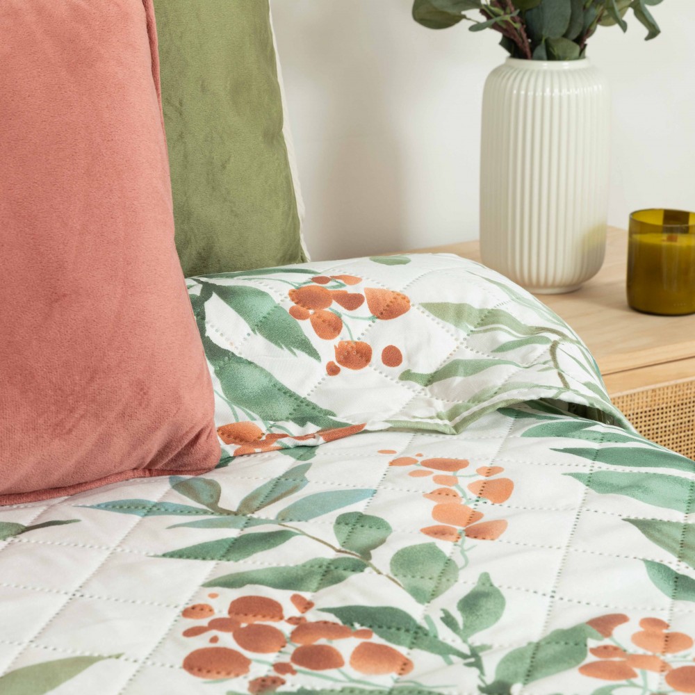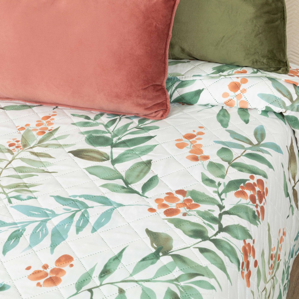 Presenta un estampada de hojas y flores en tonos verdes y naranjas sobre un fondo blanco, la cara trasera presenta el mismmo diseño.