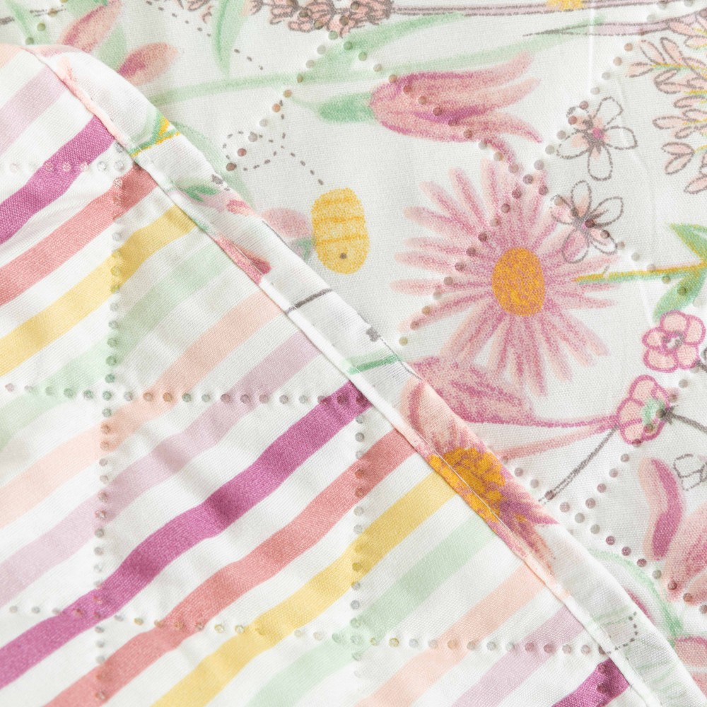 Presenta un estampado de flores y animalitos en tonos rosas, verdes y amarillos sobre un fondo blanco, la cara trasera es de rayas en los mismos tonos.