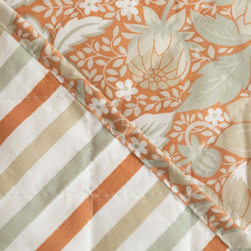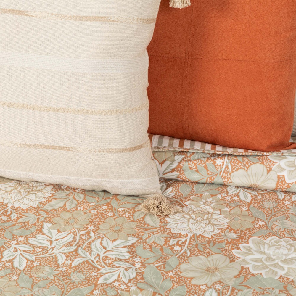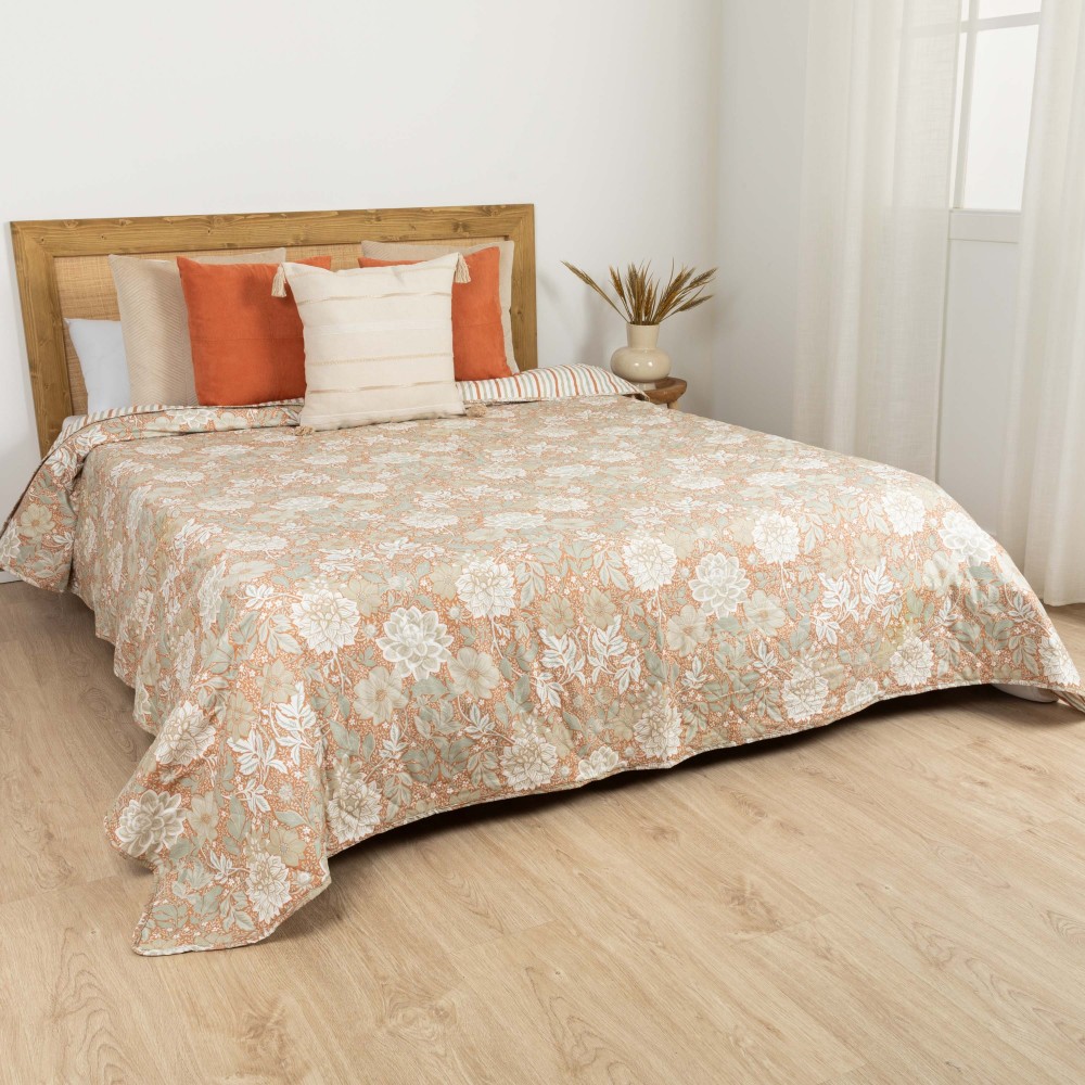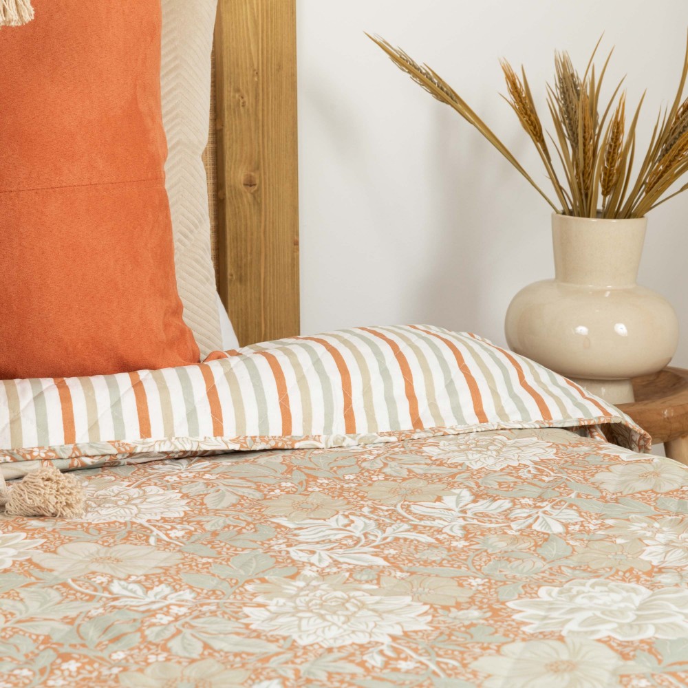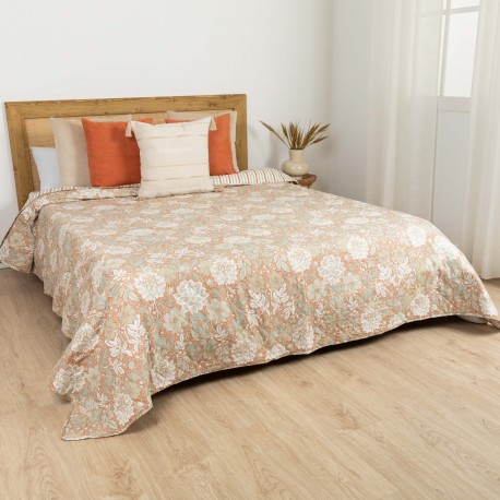 Presenta un estampado de flores y hojas en tonos arena, verde y blanco sobre un fondo teja, la cara trasera es de rayas en los mismos colores.