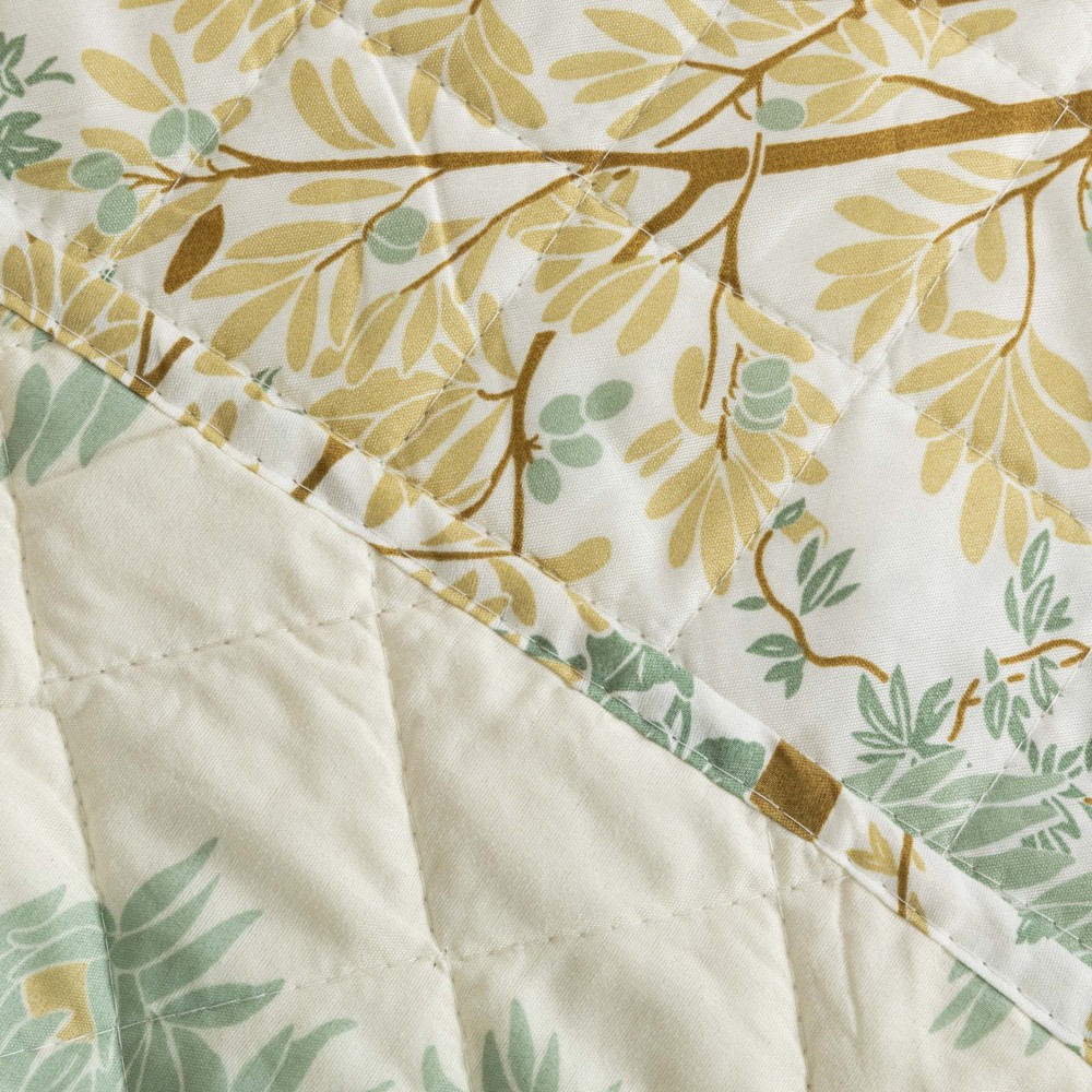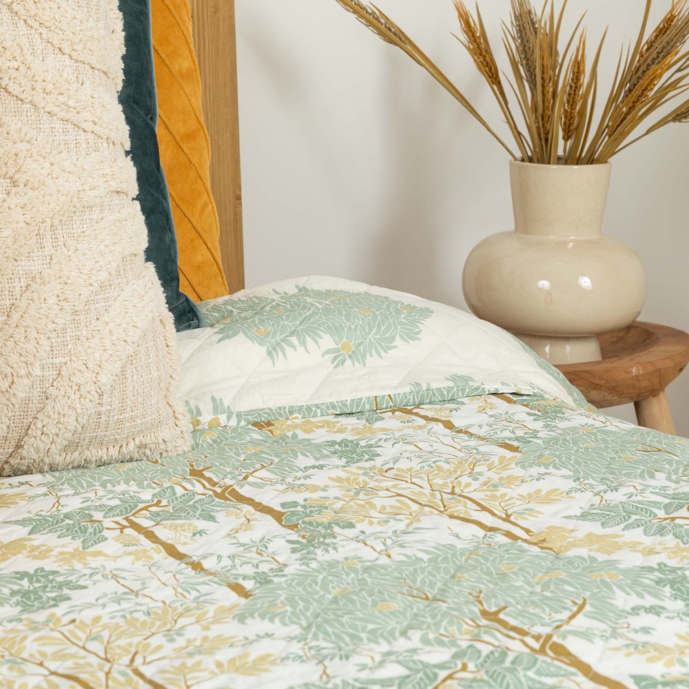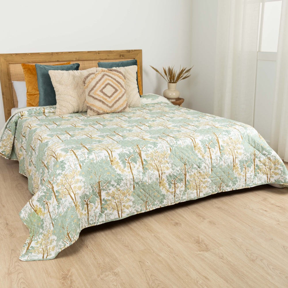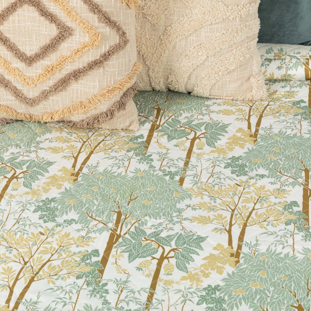 Presenta un estampado de árboles en tonos verdes y marrones sobre un fondo blanco, la cara trasera es de hojas verdes y marrones.