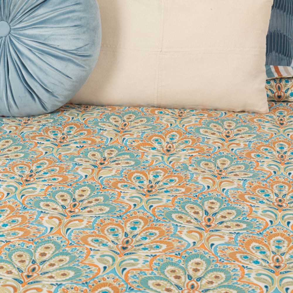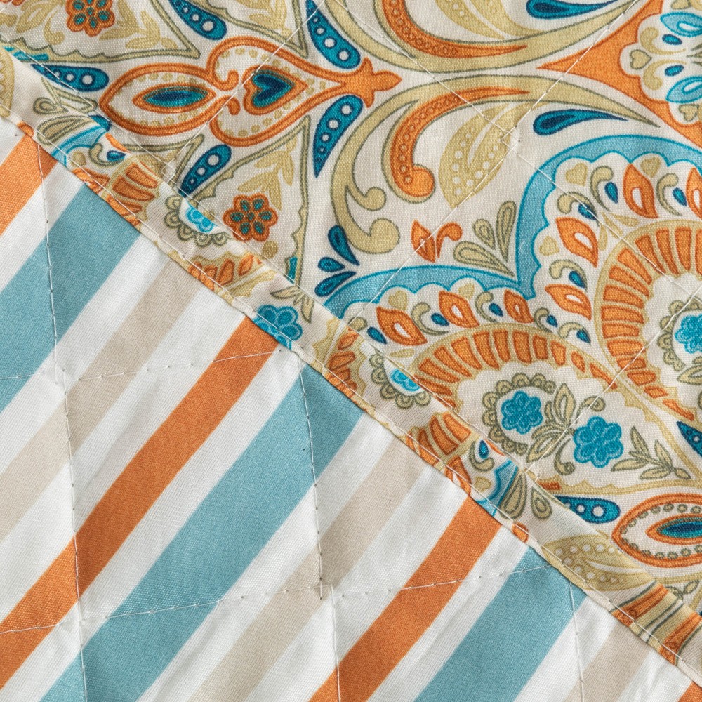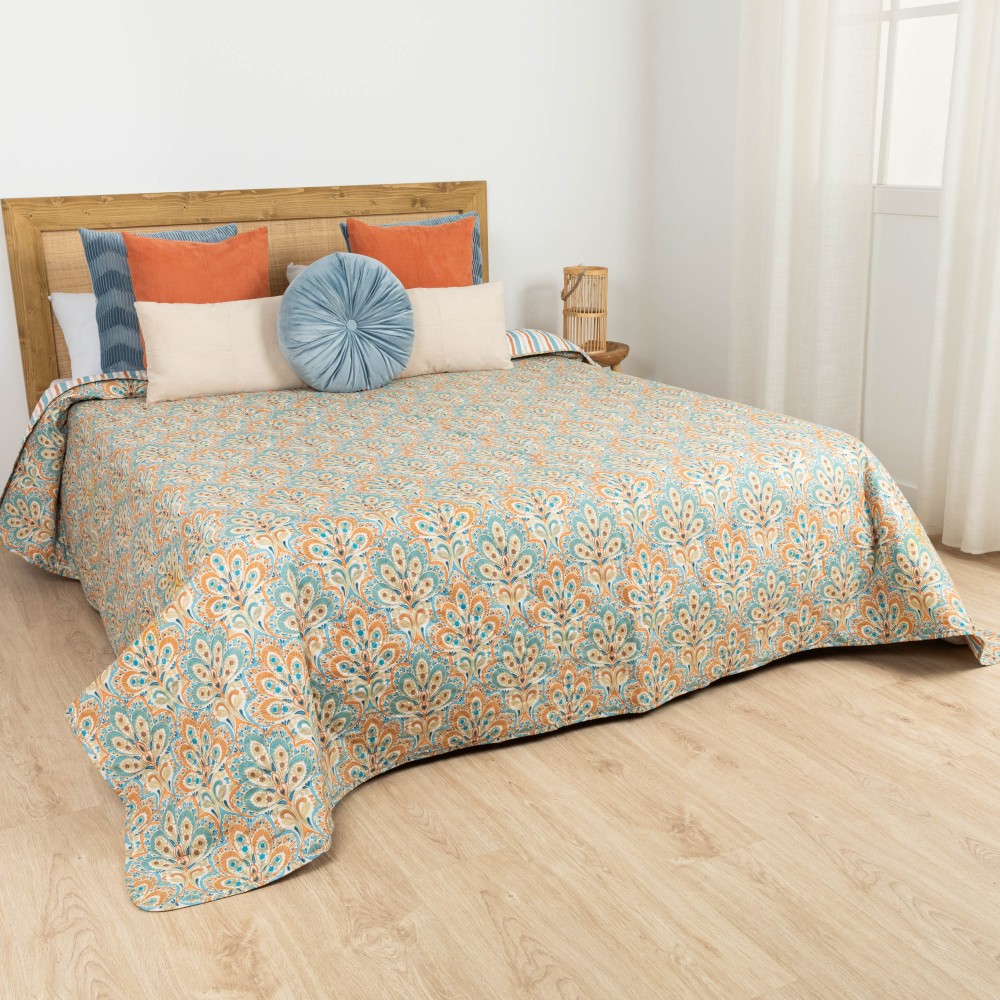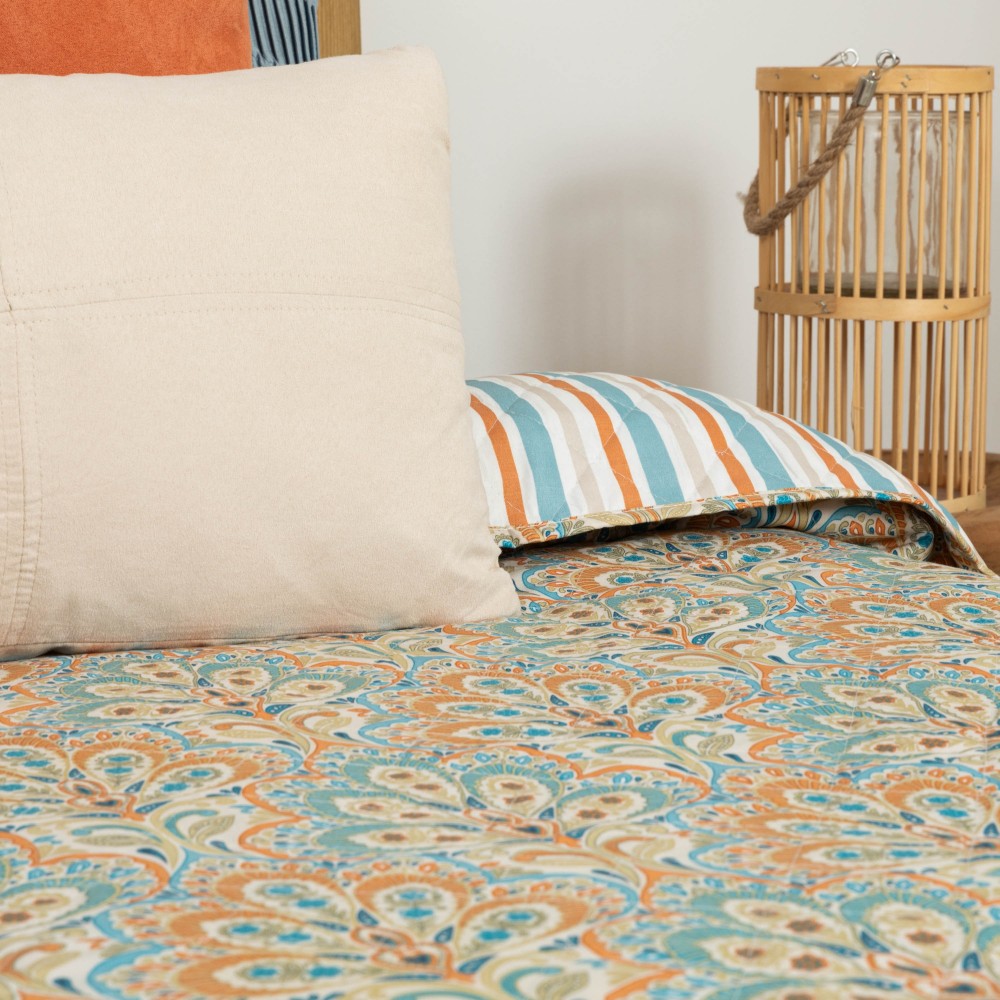 Presenta un estampado de estilo cachemir en tonos azules, arena y naranja sobre un fondo blanco, la cara trasera es de rayas en los mismos colores.