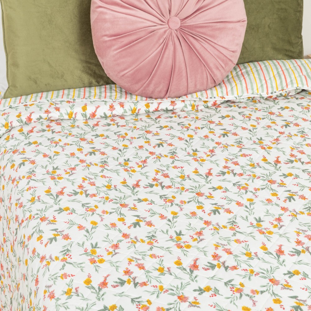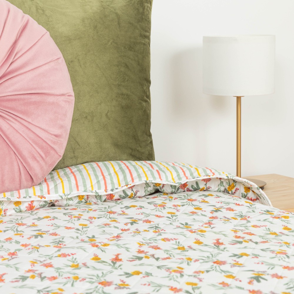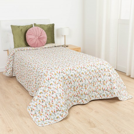 Presenta un estampado de flores en tonos verdes, rosas y amarillos sobre un fondo blanco, la cara trasera es de rayas en los mismos colores.