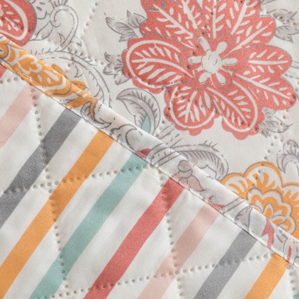 Presenta un estampado de diferentes flores en tonos rojos, naranjas y azules sobre un fondo blanco, la cara trasera es de rayas en los mismos colores.