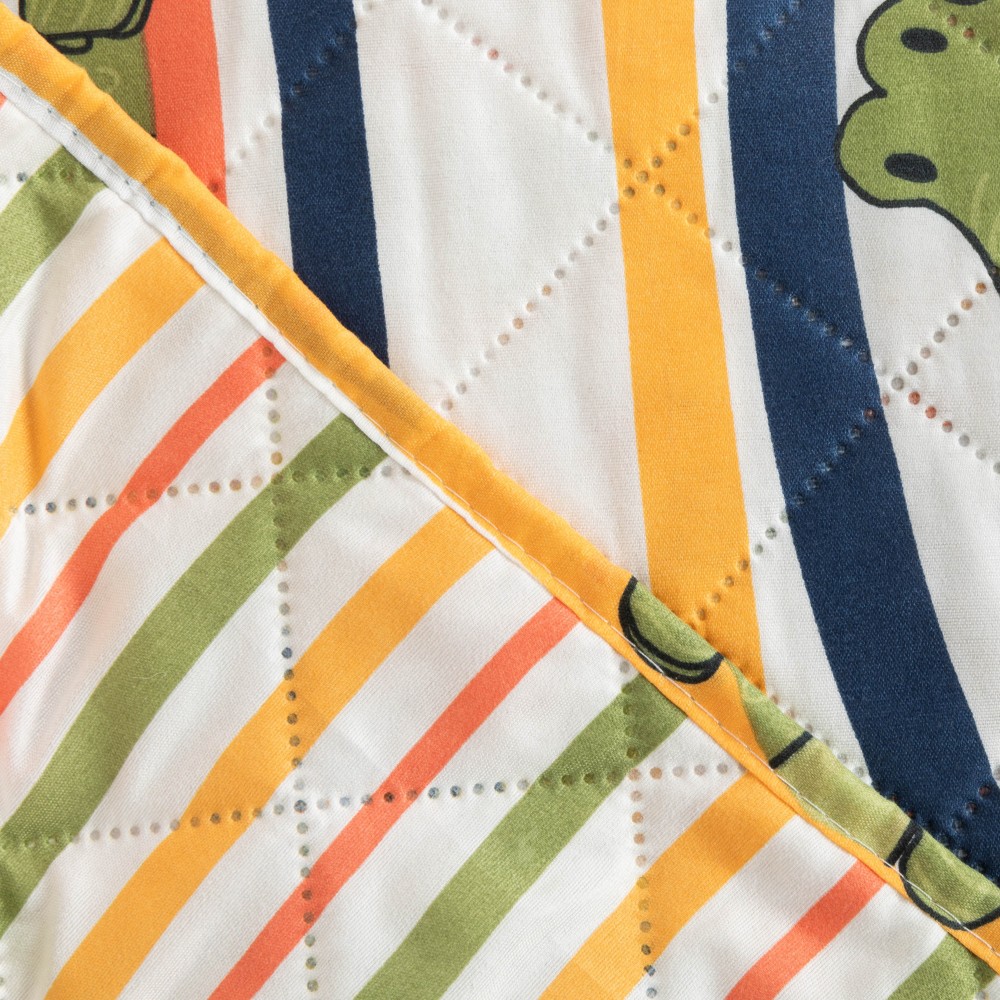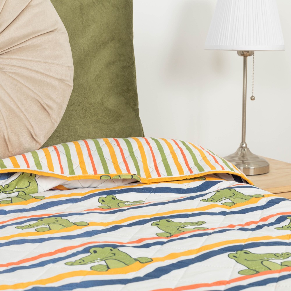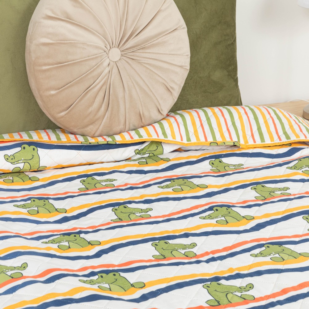 Presenta un estampado juvenil de ondas y cocodrilos en tonos verdes, azules y rojos sobre un fondo blanco, la cara trasera es de rayas en los mismos colores.
