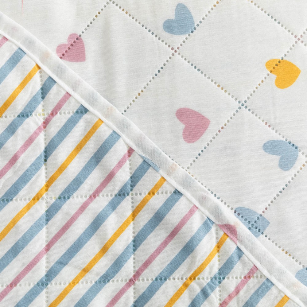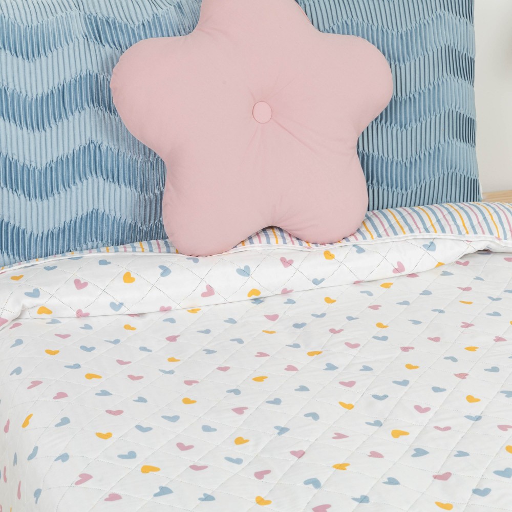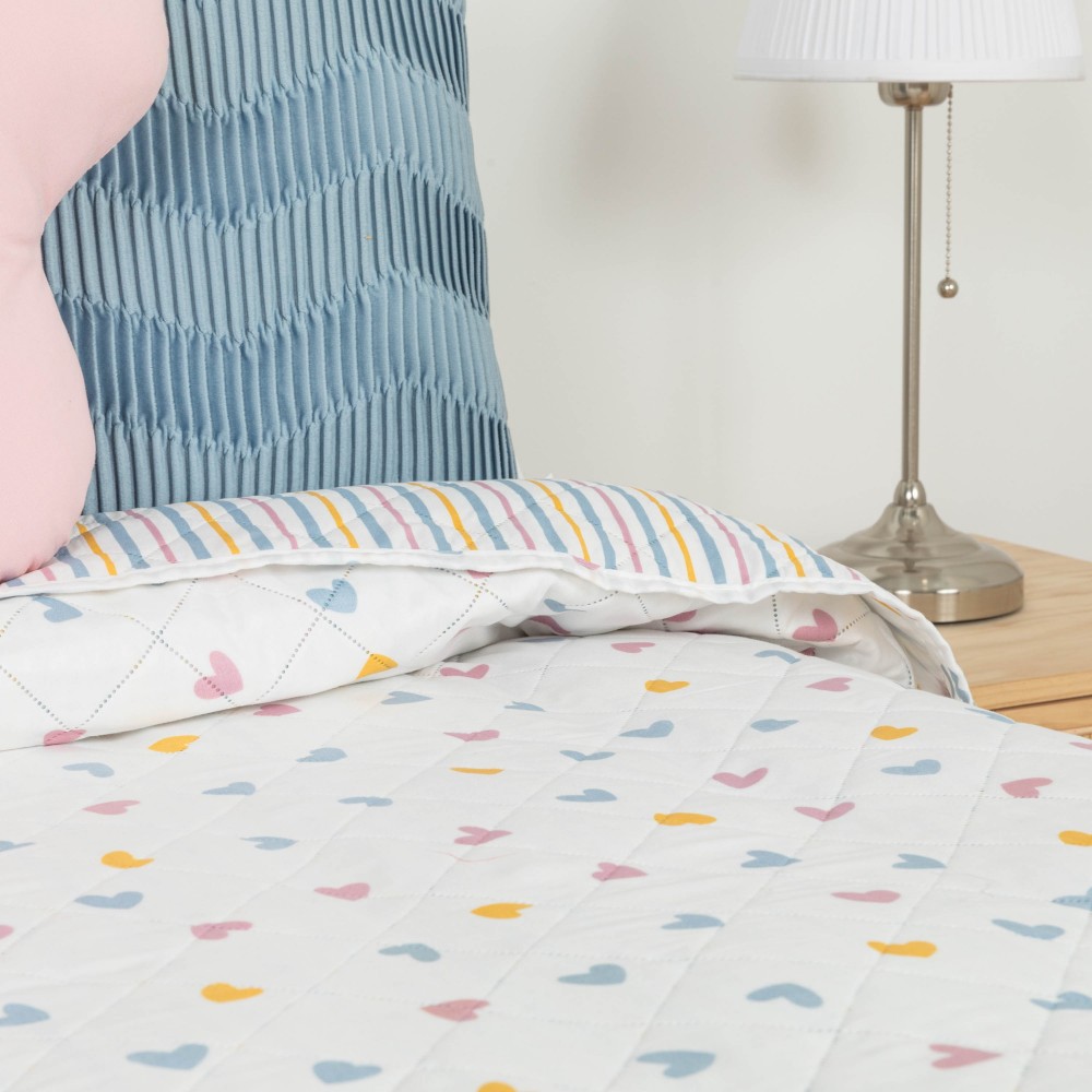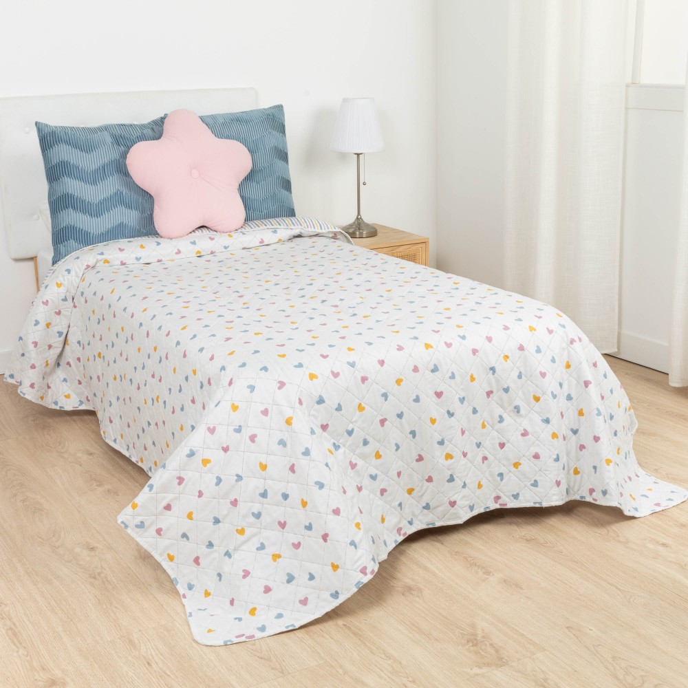 Presenta un estampado juvenil de pequeños corazones en tonos azules, rosas y naranjas sobre un fondo blanco, la cara trasera es de rayas en los mismos colores.