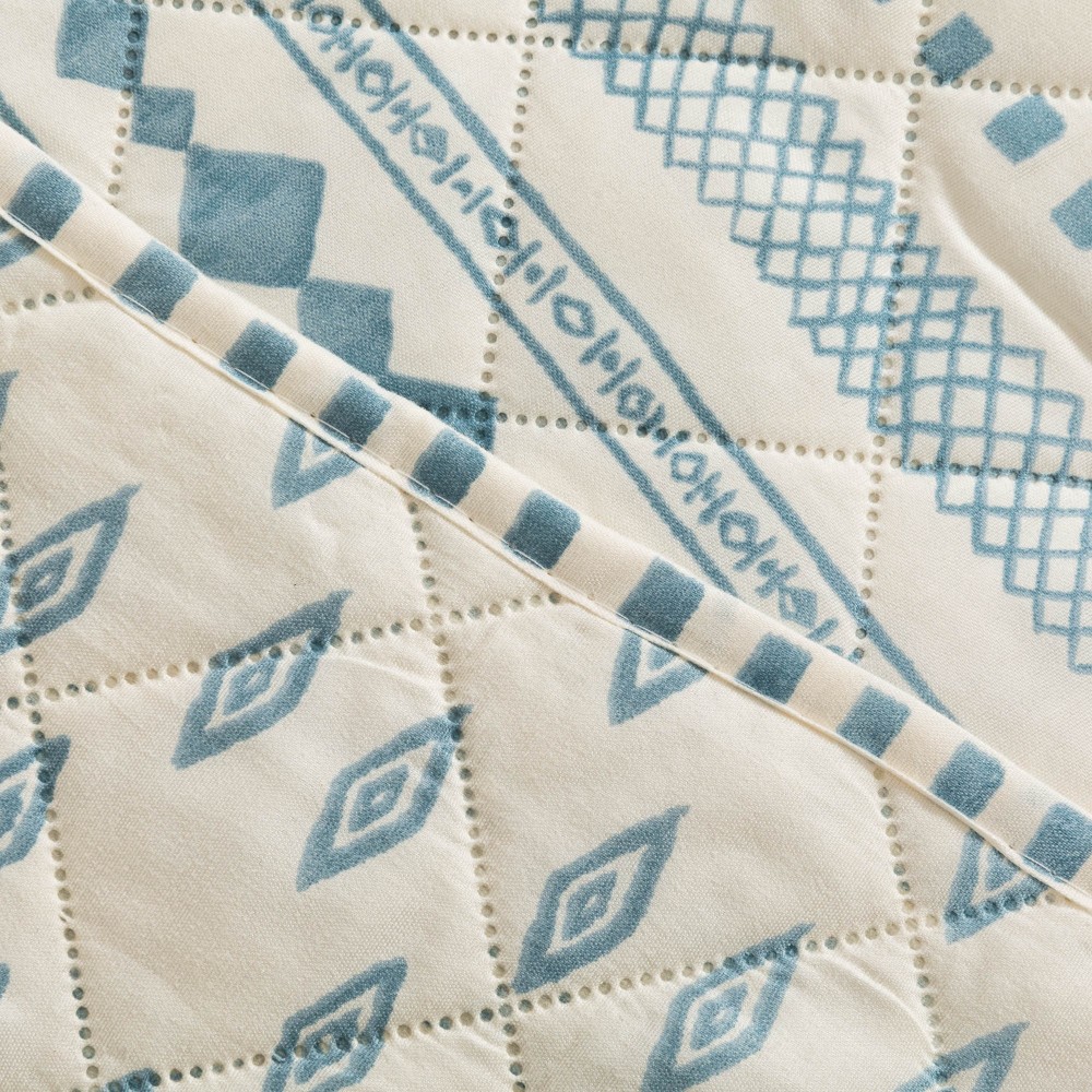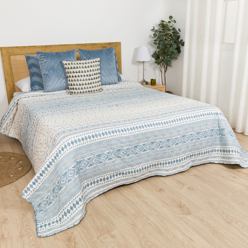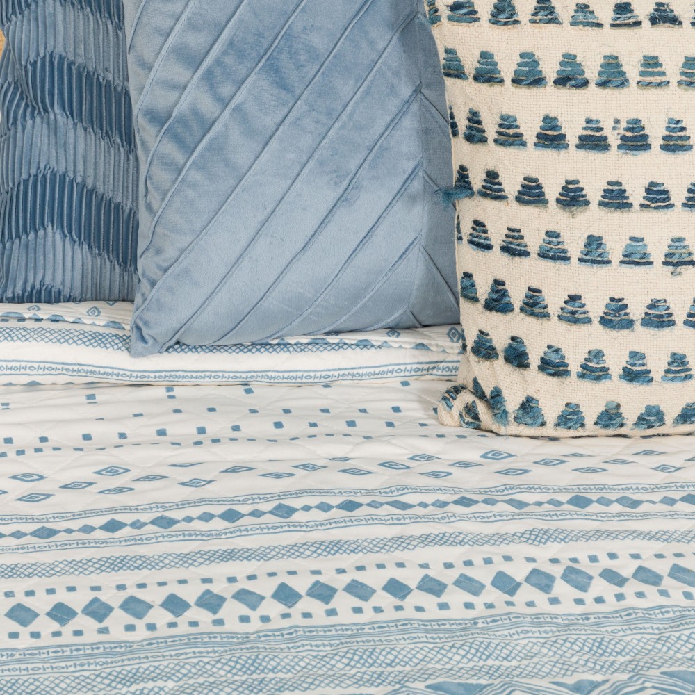 Presenta un estampado étnico en tonos azules sobre un fondo blanco, la cara trasera es de pequeños rombos en los mismos colores.