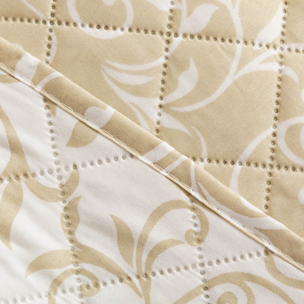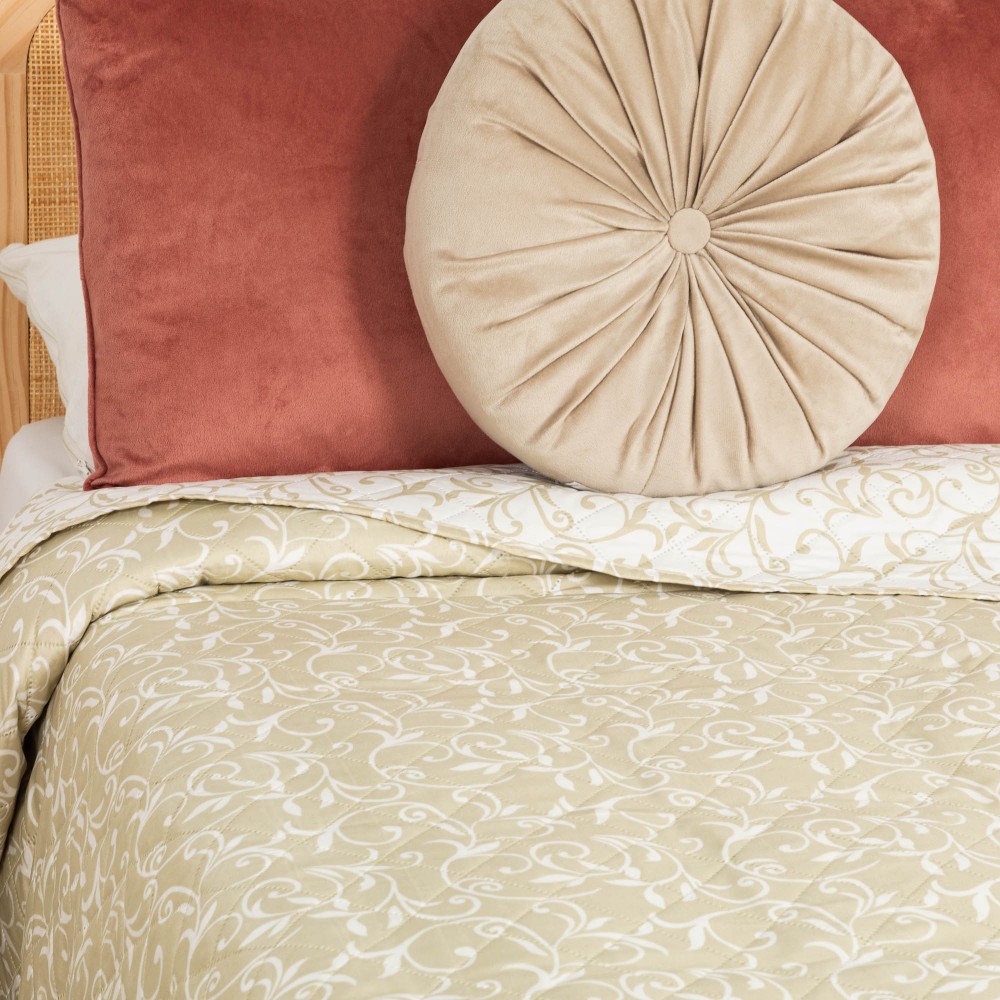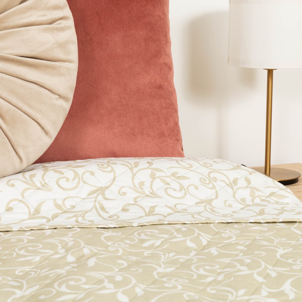 Presenta un estampado elegante de finas enredaderas de hojas en un tono blanco sobre un fondo arena, la cara trasera presenta el mismo diseño pero a la inversa, enredaderas arena sobre fondo blanco.