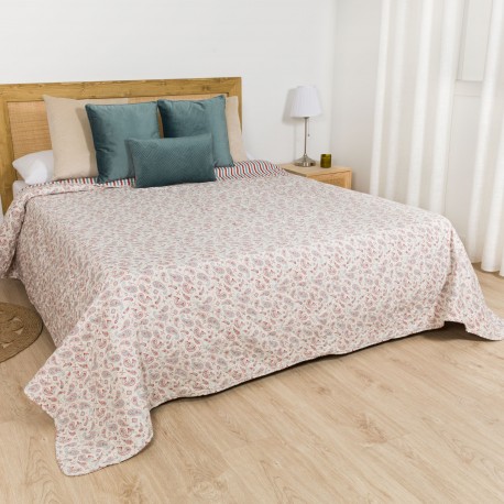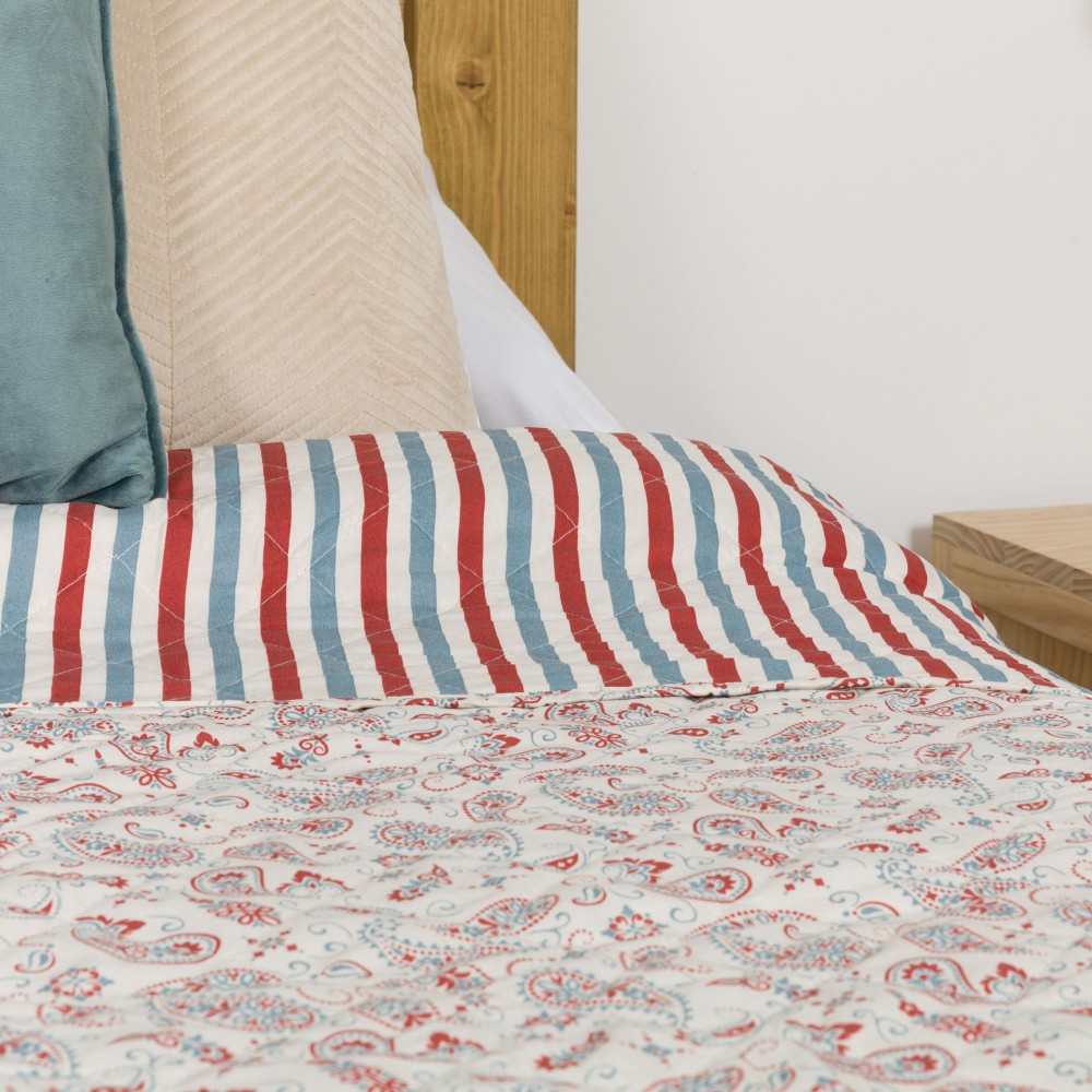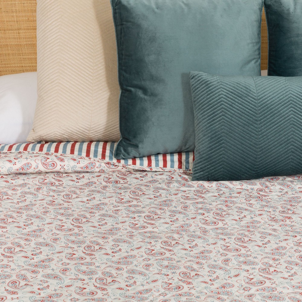 Presenta un estampado pequeño de cachemir en tonos azules y rojo sobre un fondo blanco, la cara trasera es de rayas en los mismos colores.