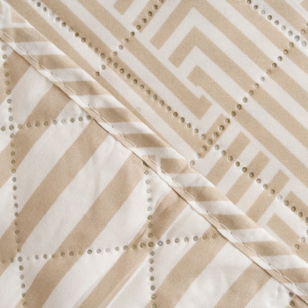 Presenta un estampado de zigzags en color arena sobre un fondo blanco, la cara trasera es de rayas en los mismos colores.