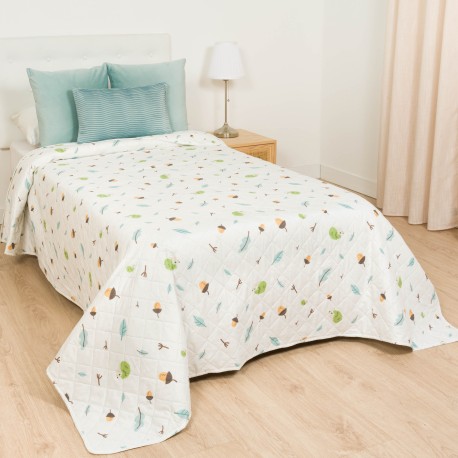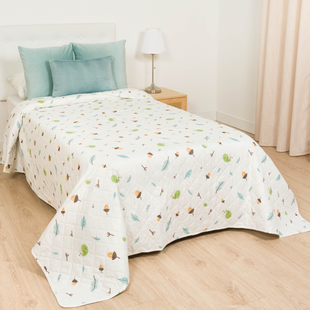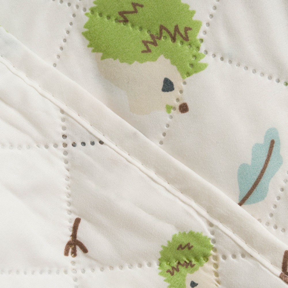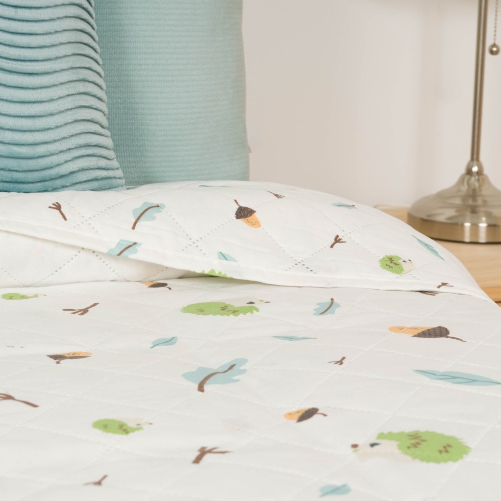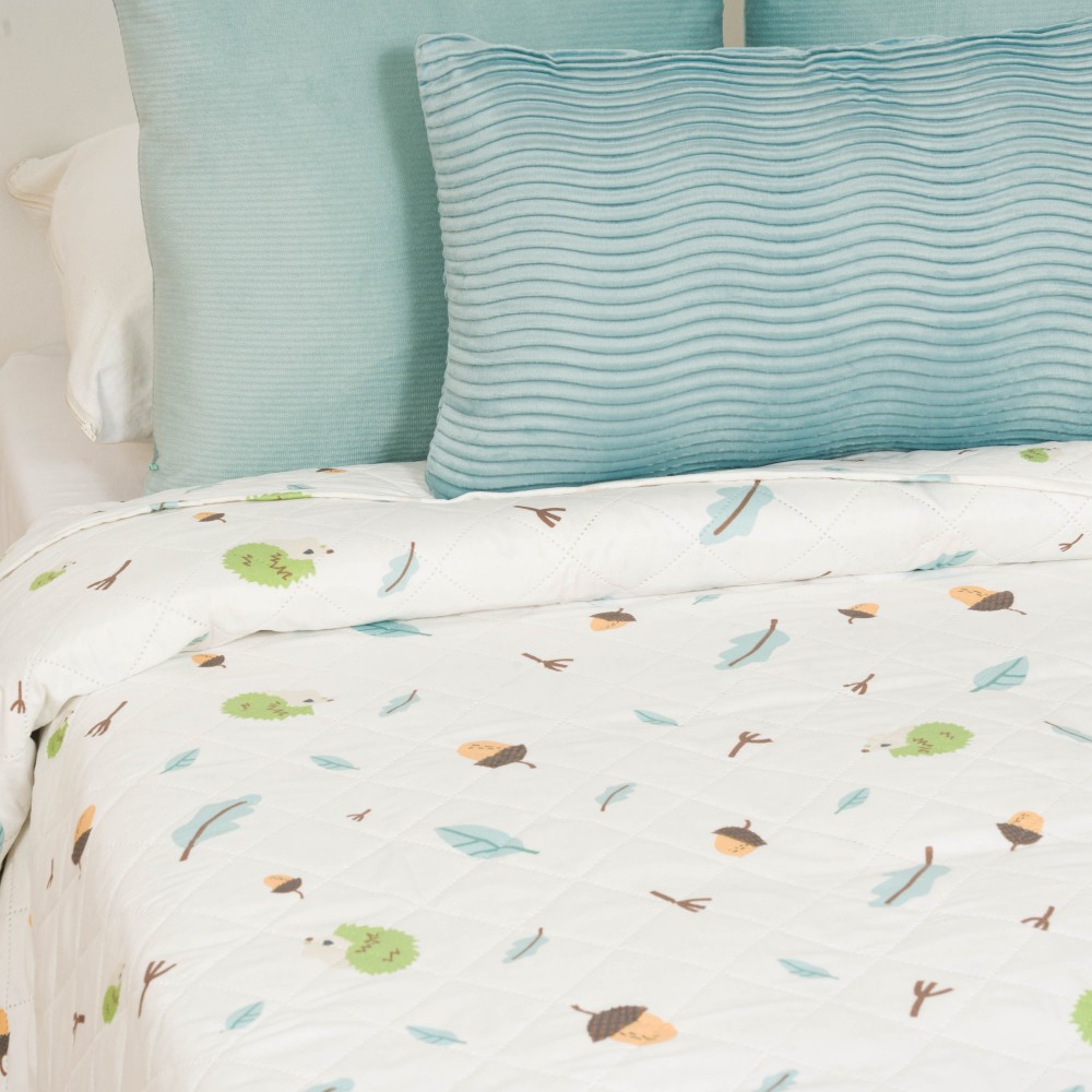 Presenta un estampado juvenil de erizos, hojas y bellotas en diferentes colores sobre un fondo blanco, la cara trasera presenta el mismo diseño.