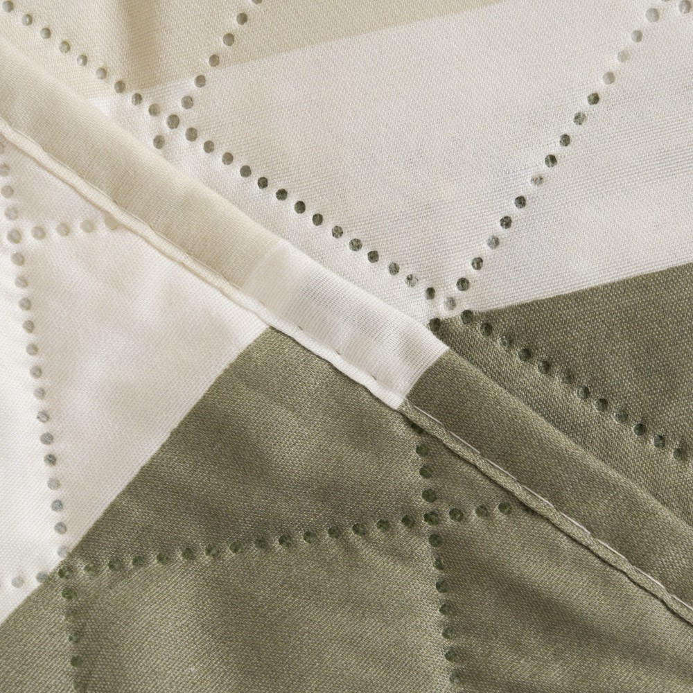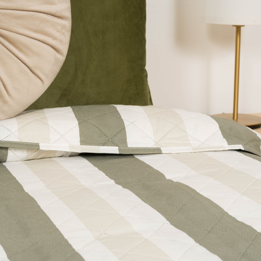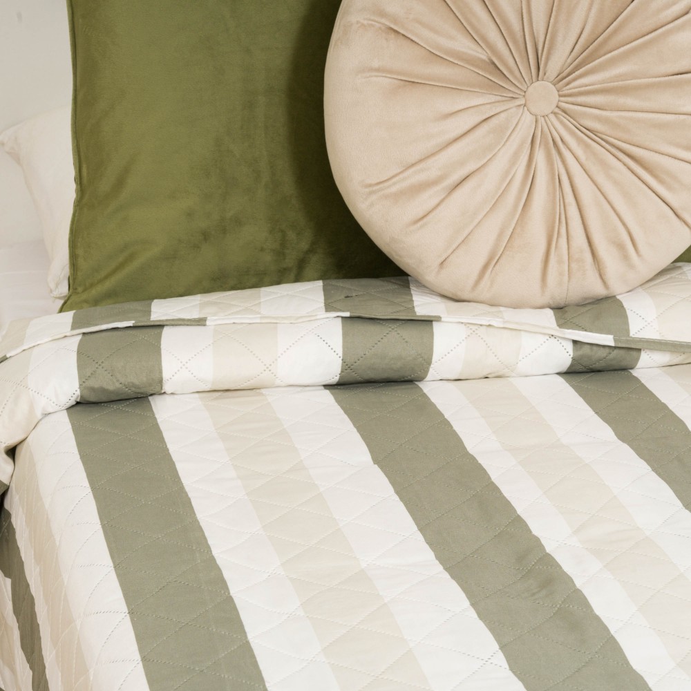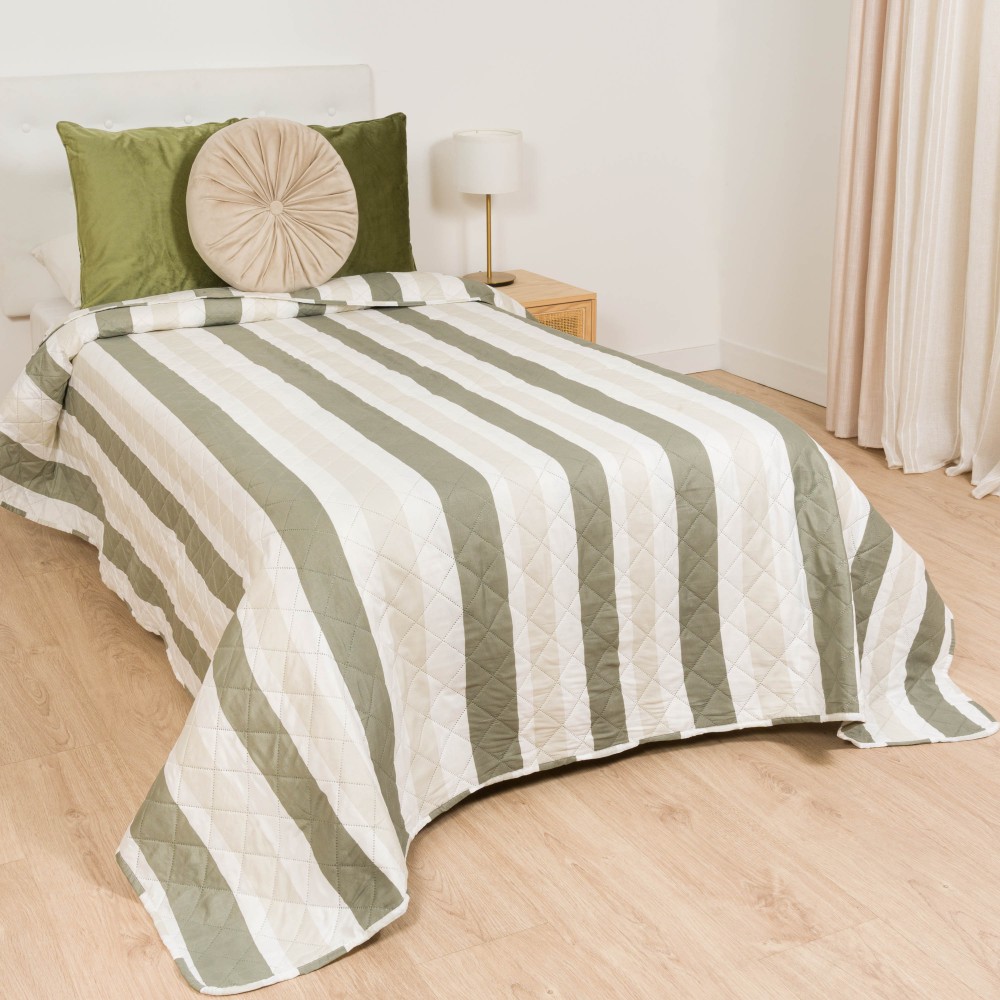 Presenta un estampado de rayas en tonos arena y verde sobre un fondo blanco, la cara trasera presenta el mismo diseño.
