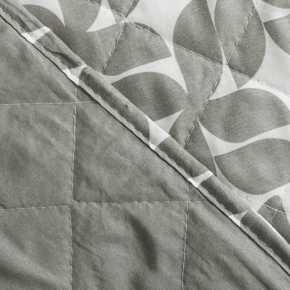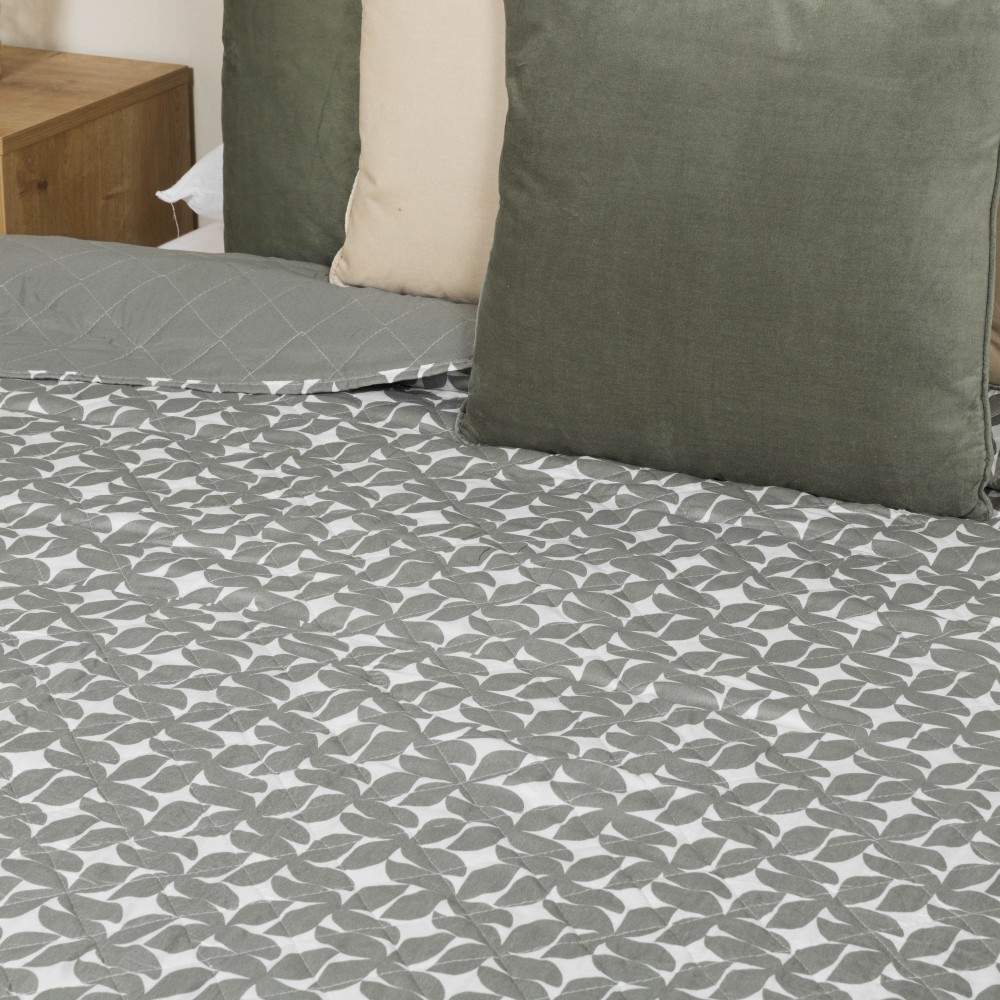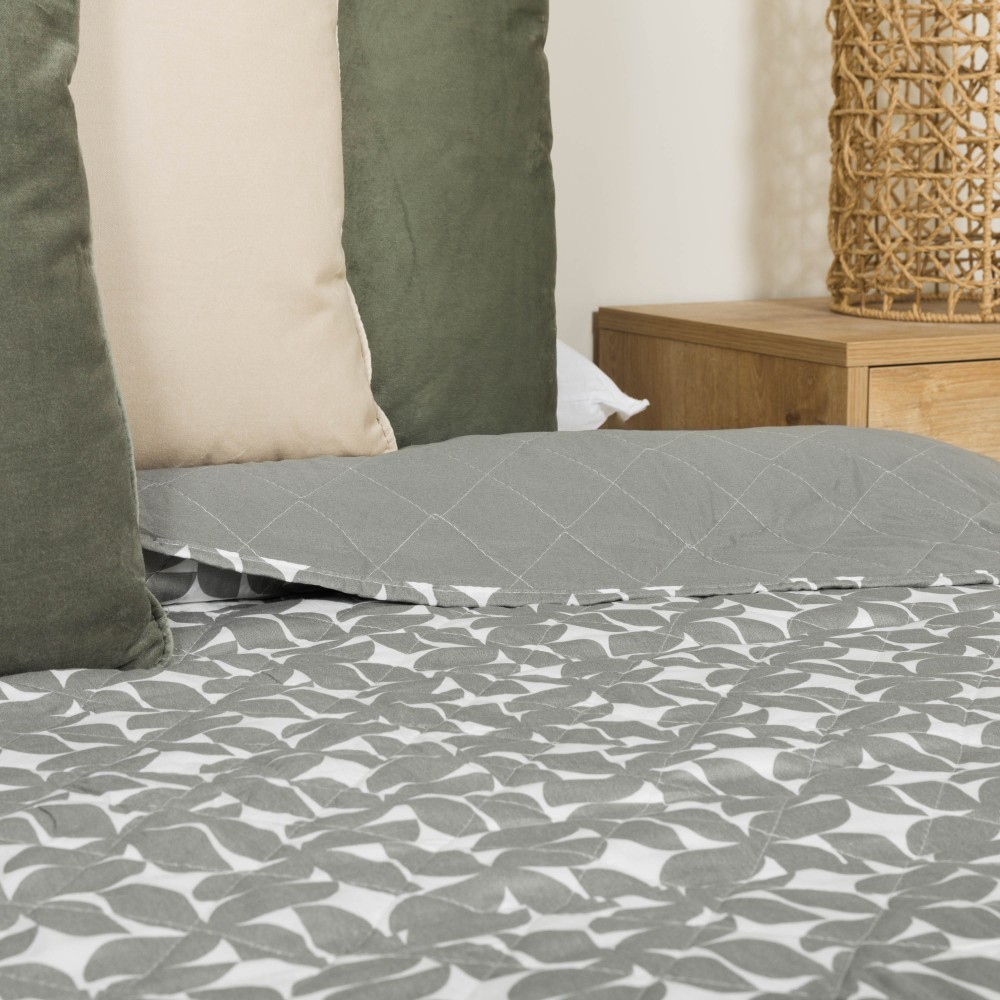 Presenta un estampado de flores grises sobre un fondo blanco, la cara trasera es lisa de color gris.