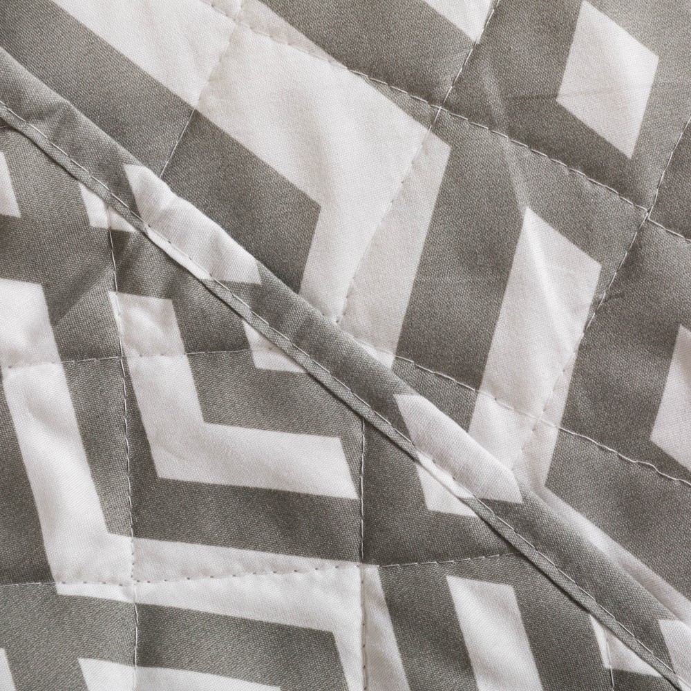 Presenta un estampado geométrico de rombos entrelazados de color verde sobre un fondo blanco, la cara trasera cuenta con el mismo diseño.