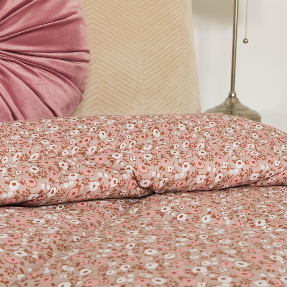 Cara frontal con estampado de pequeñas flores rosas y blancas sobre un fondo rosa, la cara trasera es de color rosa lisa.