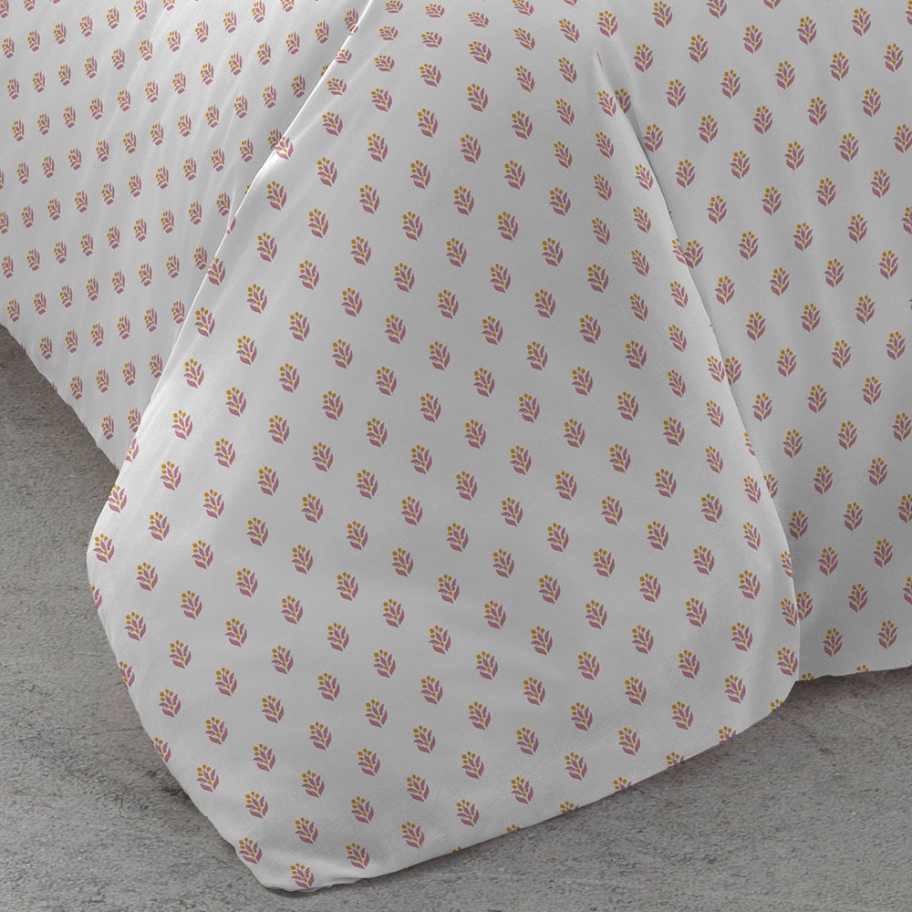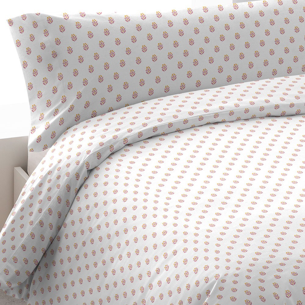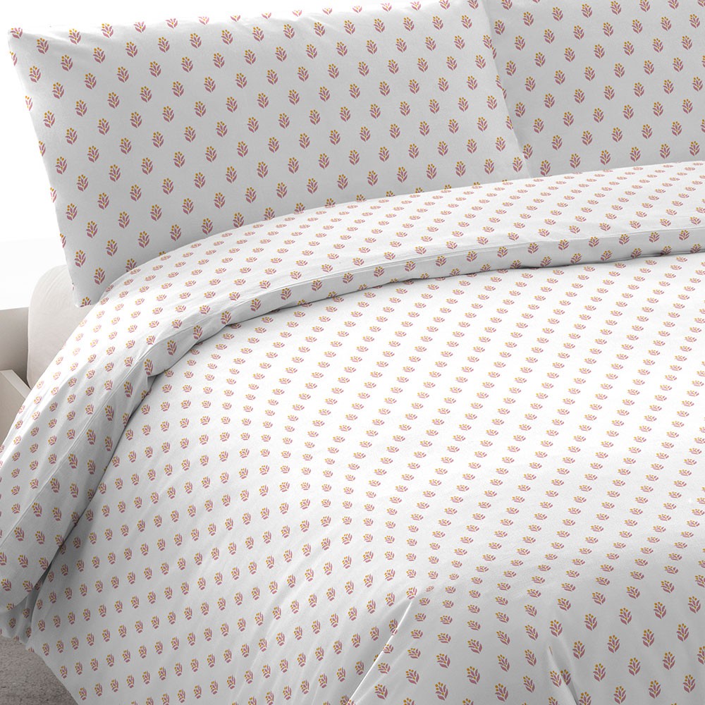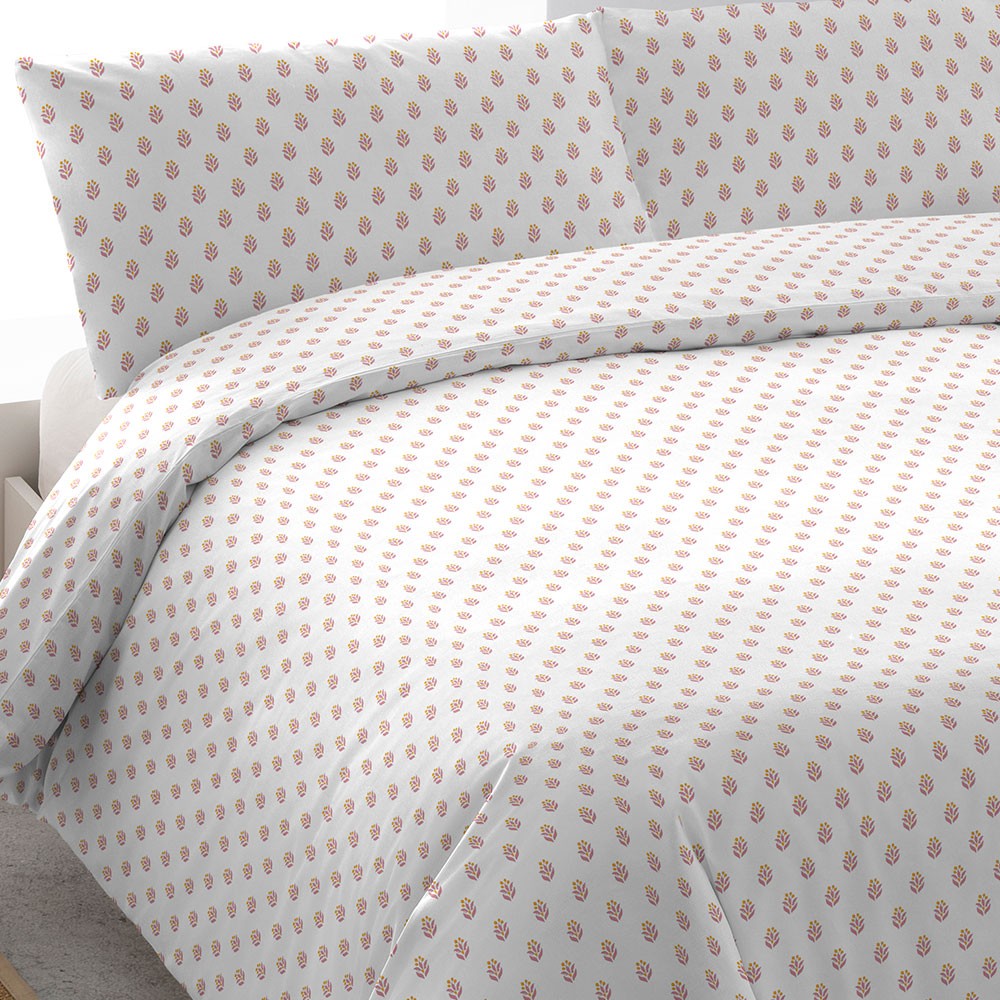 Funda de almohada y funda nórdica con estampado elegante de pequeñas flores en tonos rosa marsala y naranja sobre un fondo blanco.