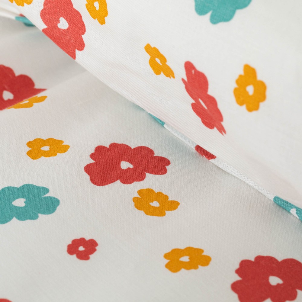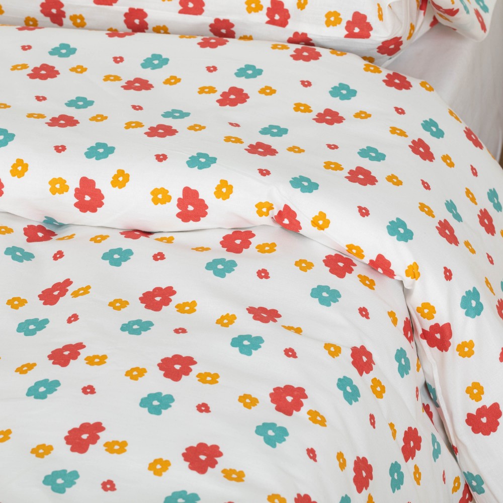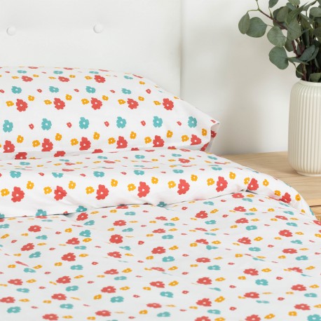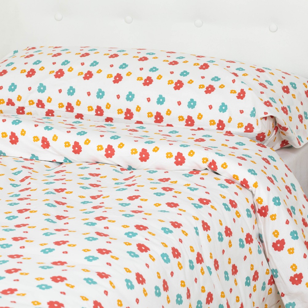 Funda de almohada y funda nórdica con un estampado juvenil de flores en tonos rojos, naranjas y verdes sobre un fondo blanco.
