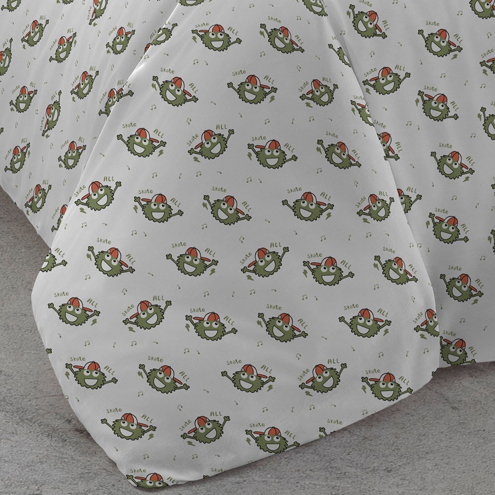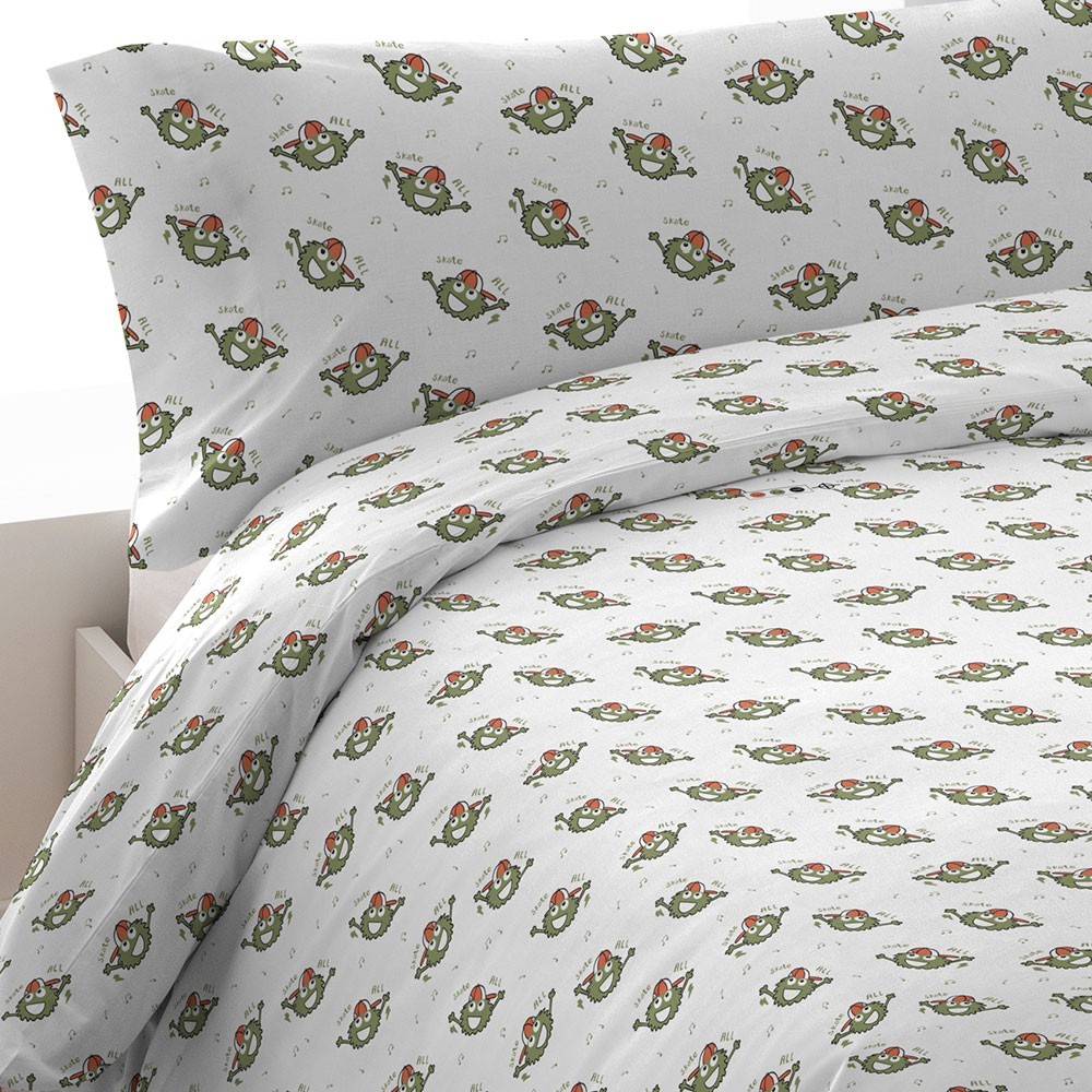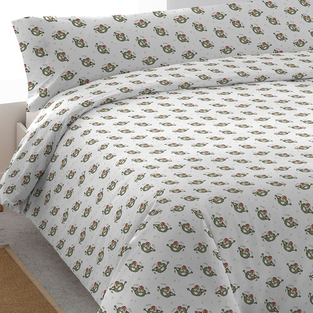 Funda de almohada y funda nórdica con estampado de pequeños muñecos verdes sobre un fondo blanco.