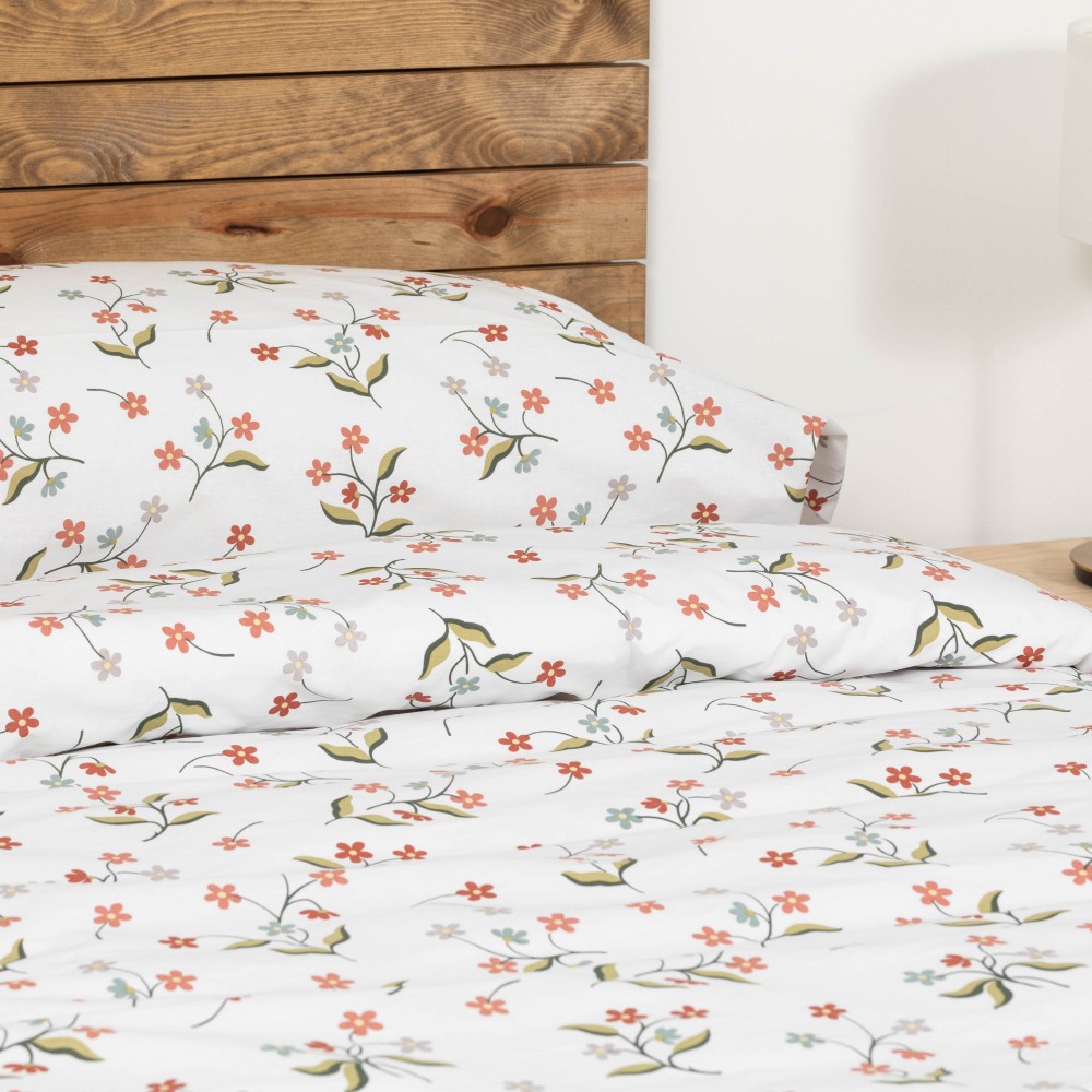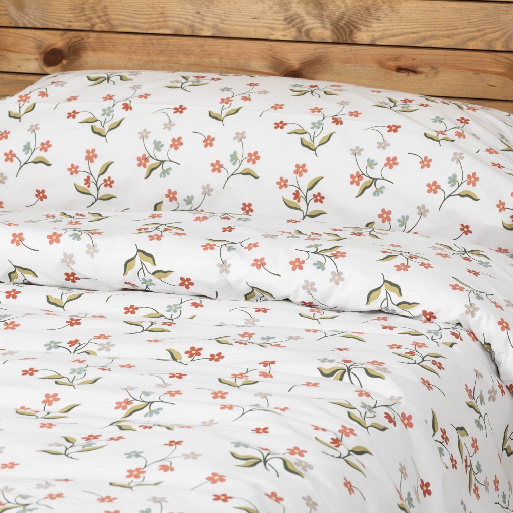 Funda de almohada y funda nórdica con estampado de pequeñas flores naranjas, azules, rosas y verdes sobre un fondo blanco.
