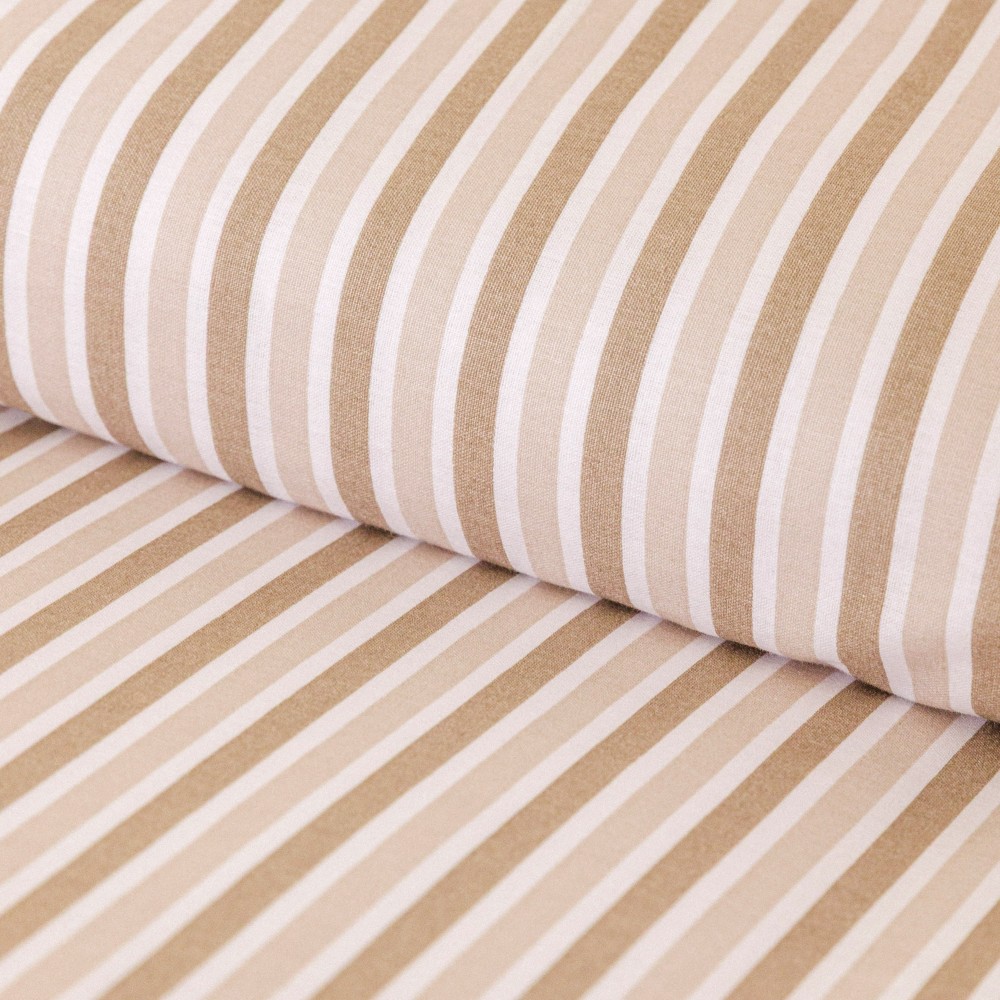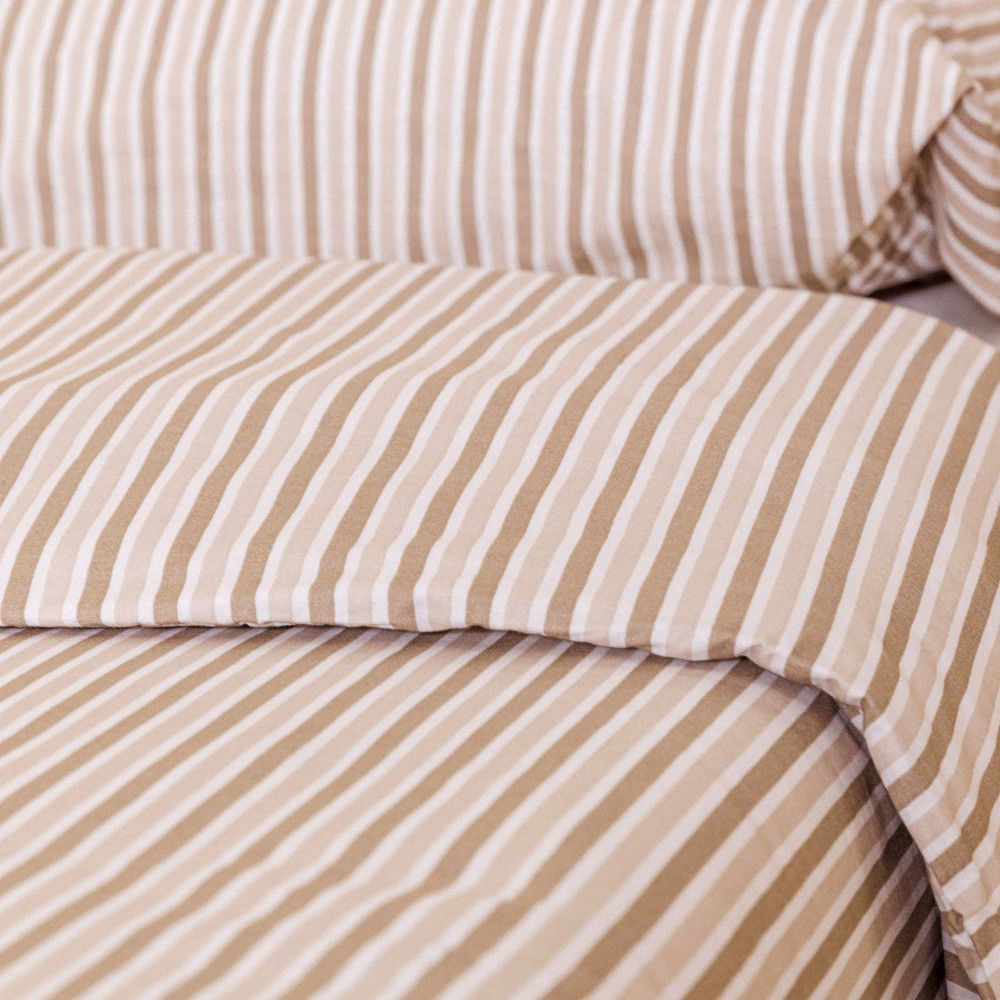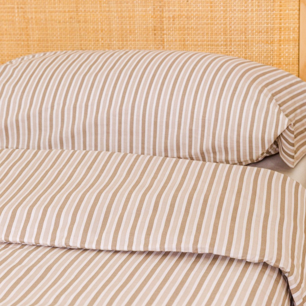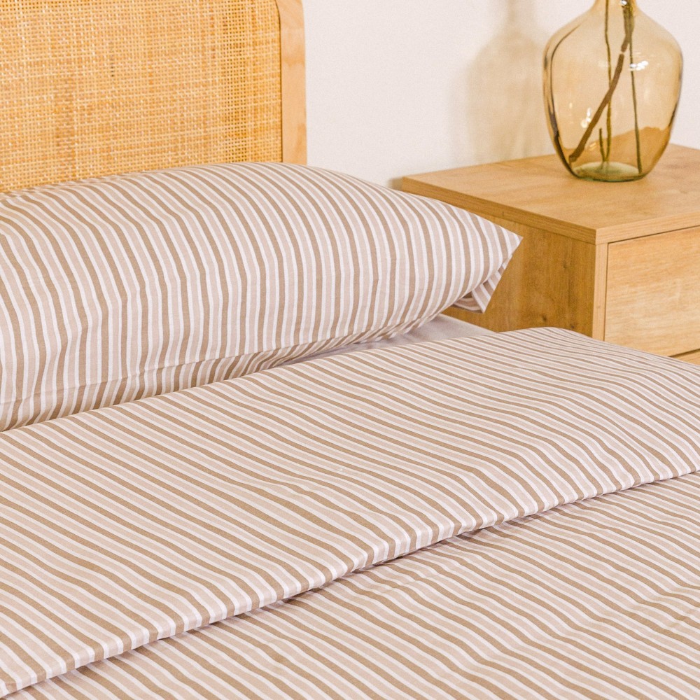 Funda de almohada y funda nórdica con estampado de diferentes rayas en tonos marrones sobre un fondo blanco.
