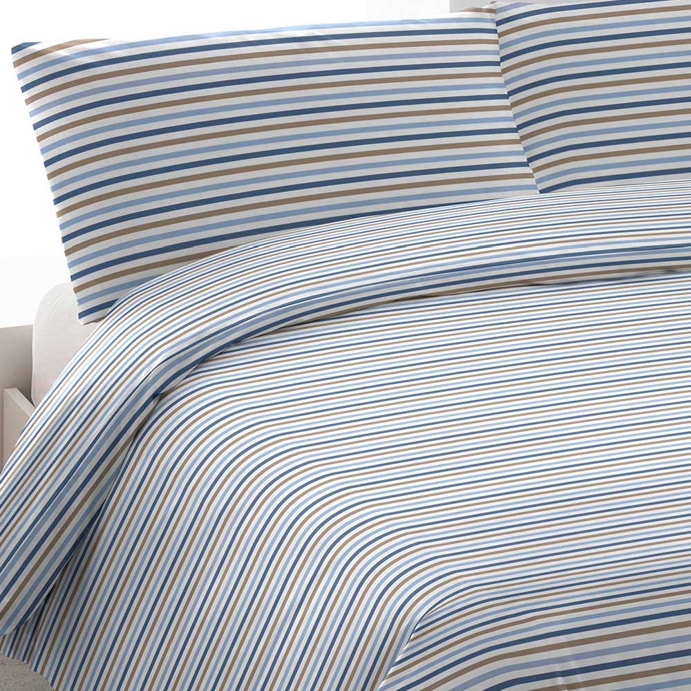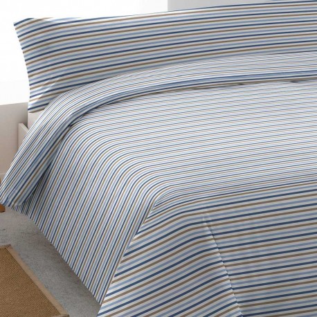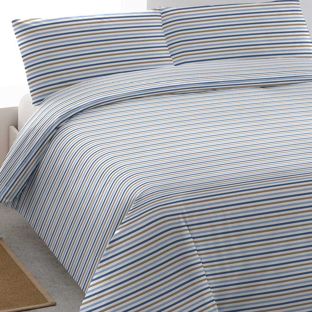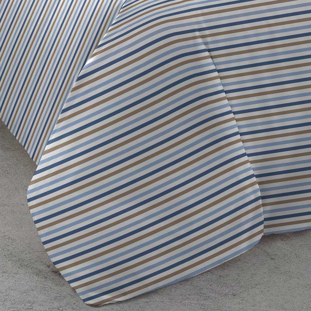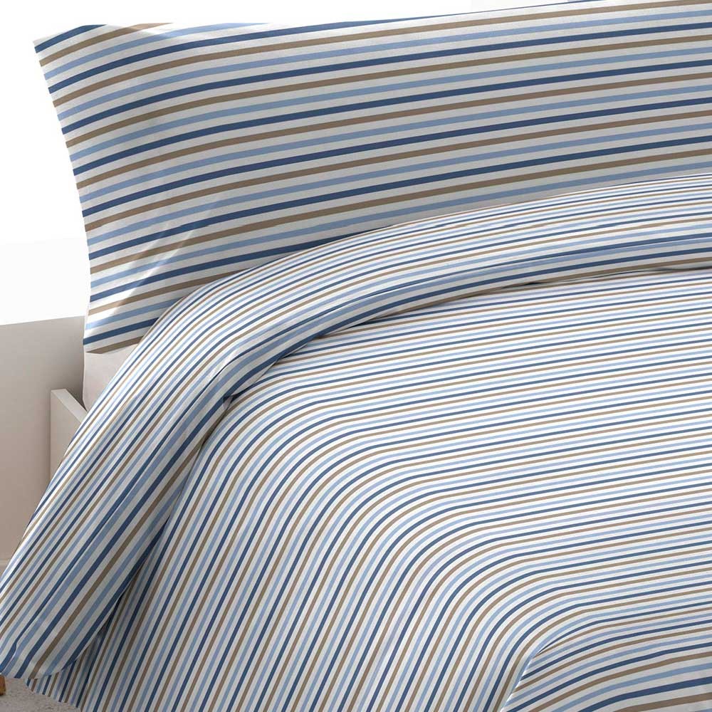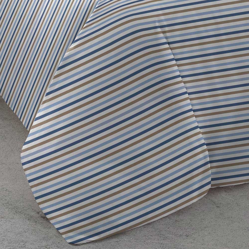 Nórdico y funda de almohada 100% algodón percal con rayas en diferentes tonos de azul y marrón sobre un fondo blanco, elevada resistencia a los lavados y excelente transpirabilidad. ¡Dale color a tu nueva habitación con un estampado original y fácilmente combinable!