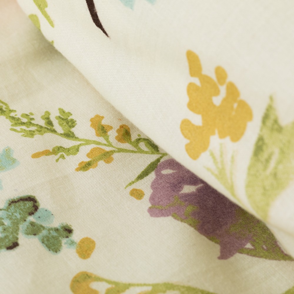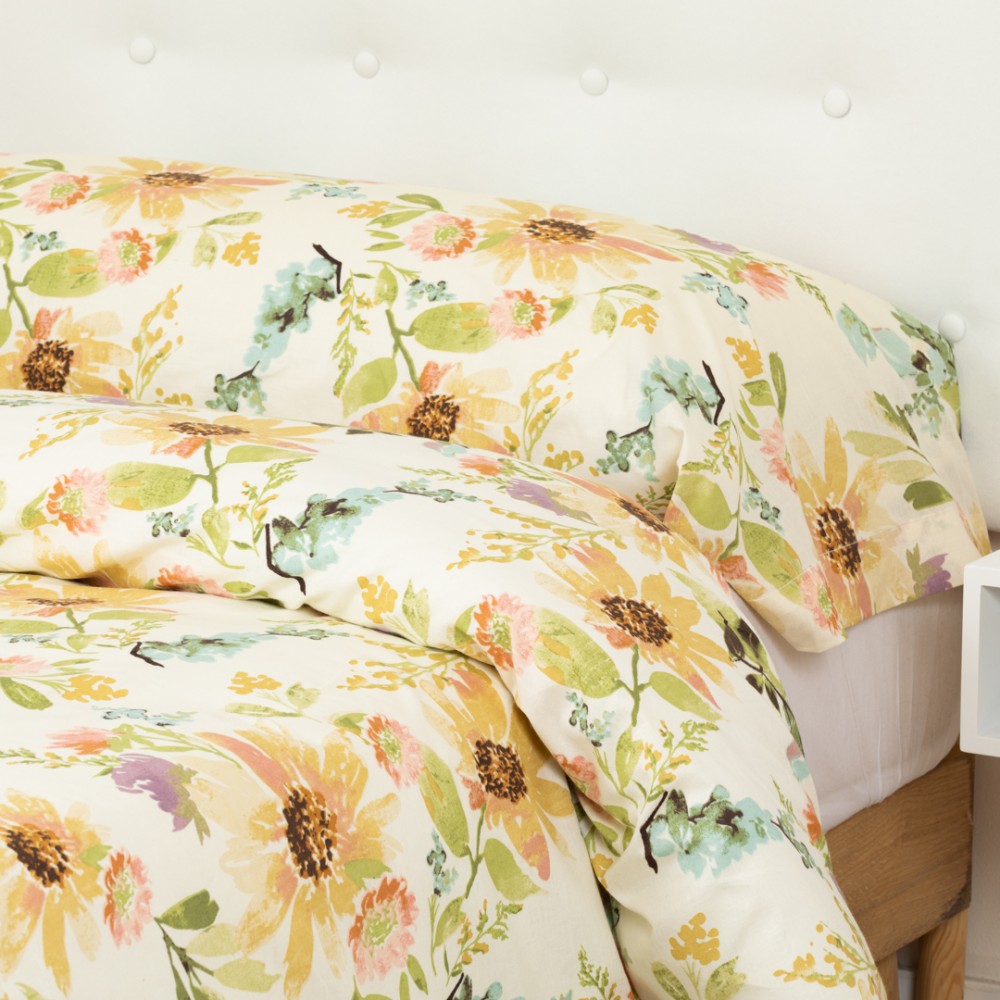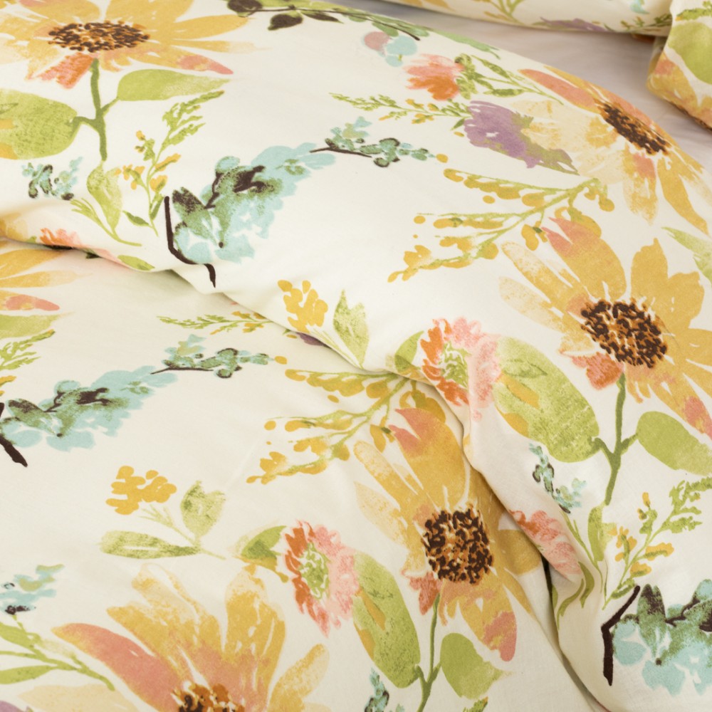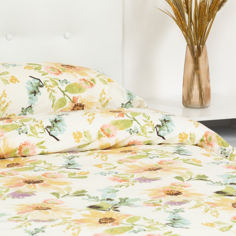 Funda nórdica 100% algodón percal de elevada resistencia a los lavados y excelente transpirabilidad con un estampado primaveral de grandes flores en tonos arena, verde, malva y azul sobre un fondo blanco, la cara trasera presenta el mismo diseño.