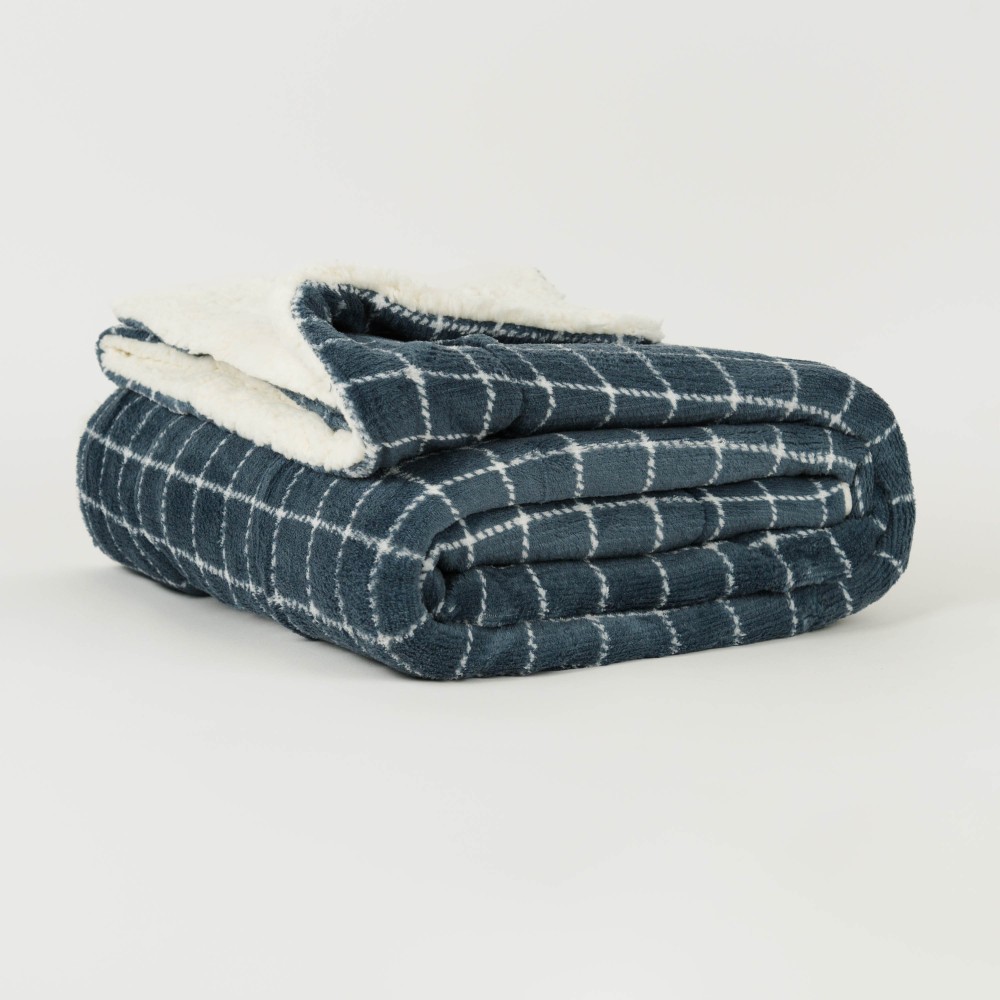 Manta sherpa modelo Cuadro Pruden azul azafata, extra suave 100% poliéster.