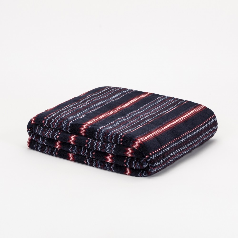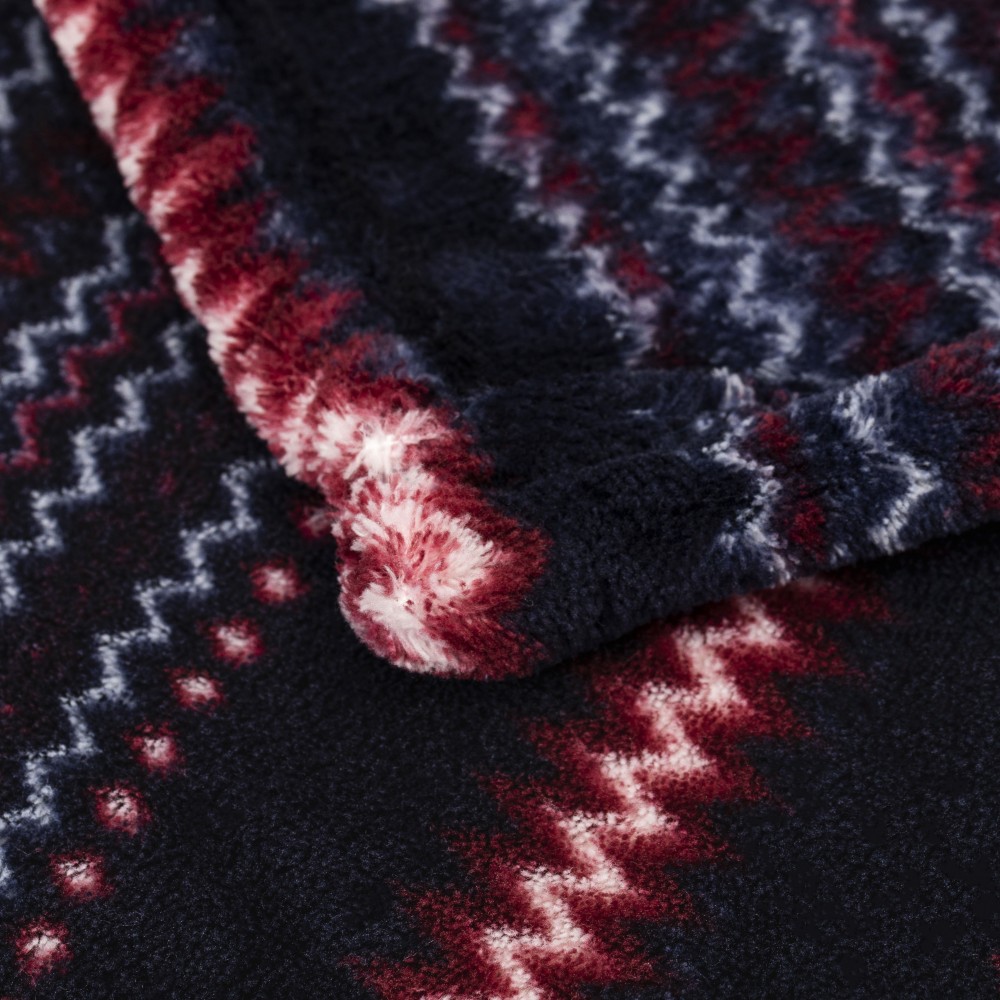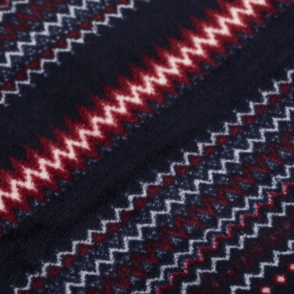 Presenta un estampado de zigzag en tonos rojo y blanco sobre un fondo azul marino en tejido coralina. La coralina tiene un acabado aterciopelado, agradable al tacto, cálido y muy suave. Es tejido de microfibra 100% poliéster.