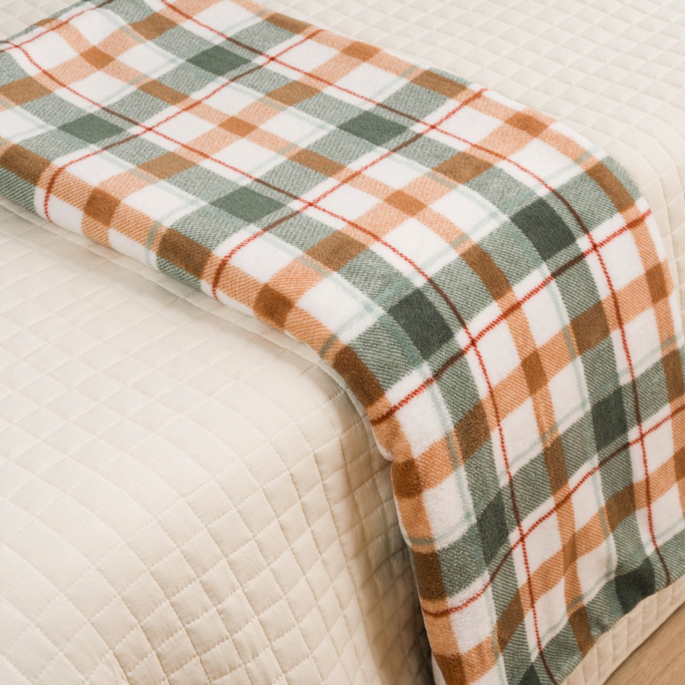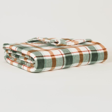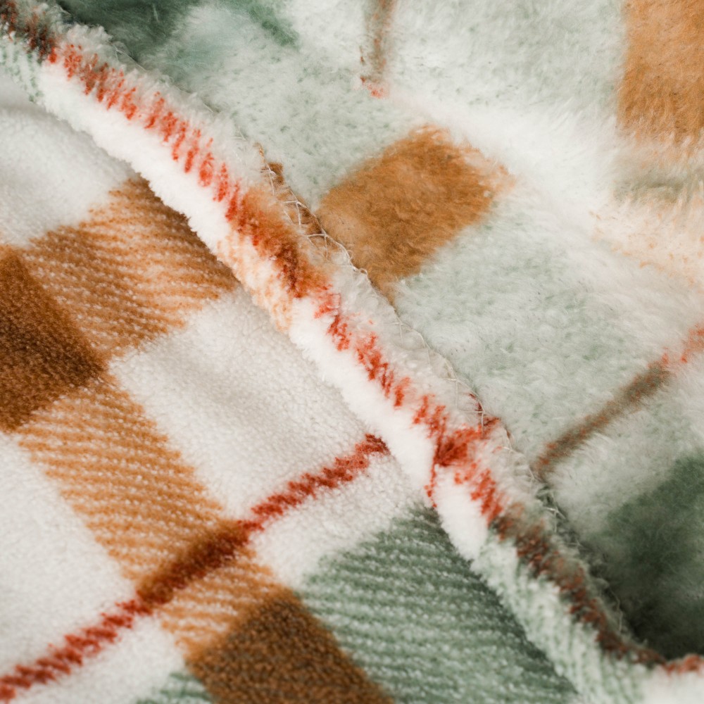 Presenta un estampado de cuadros verdes y marrones sobre un fondo blanco en tejido coralina. La coralina tiene un acabado aterciopelado, agradable al tacto, cálido y muy suave.