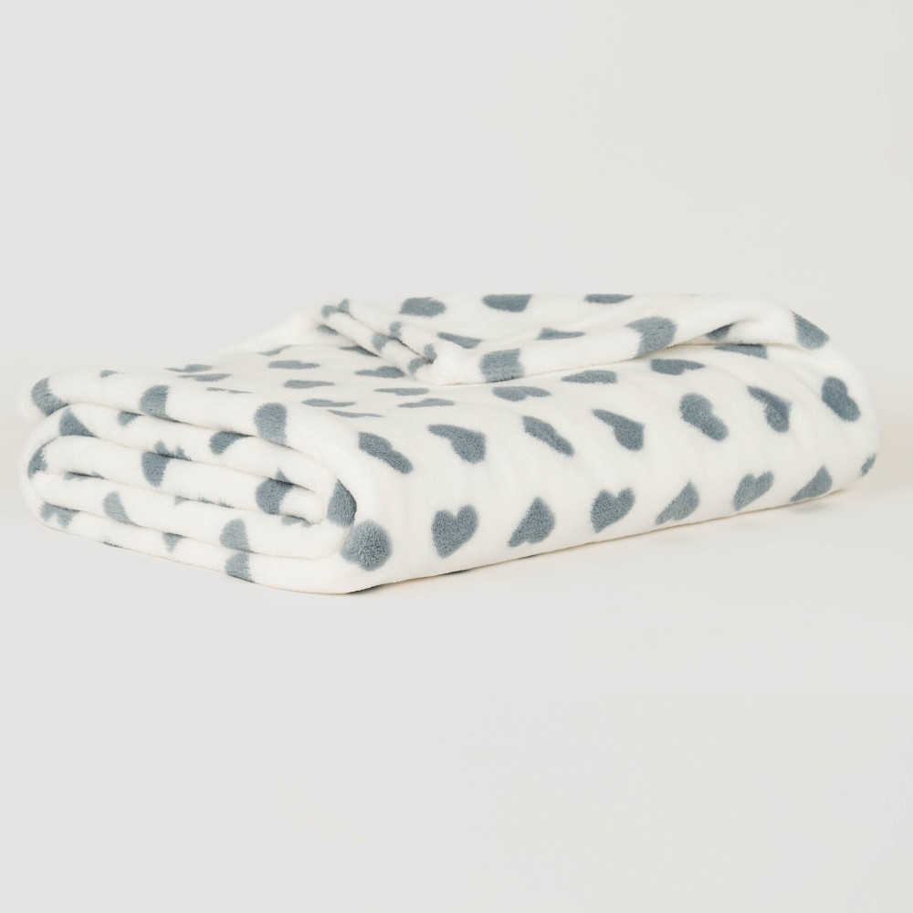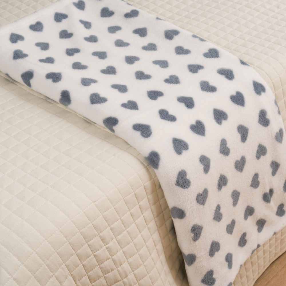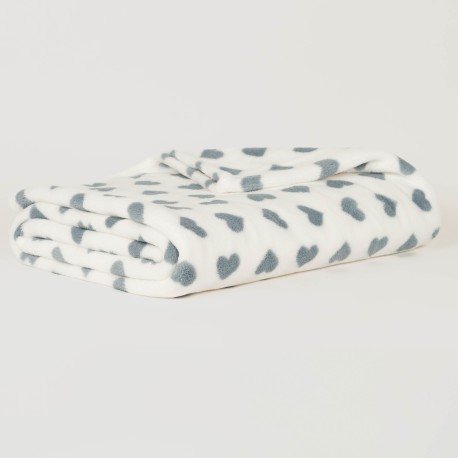 Presenta un estampado de corazones azules sobre un fondo blanco en tejido coralina. La coralina tiene un acabado aterciopelado, agradable al tacto, cálido y muy suave.