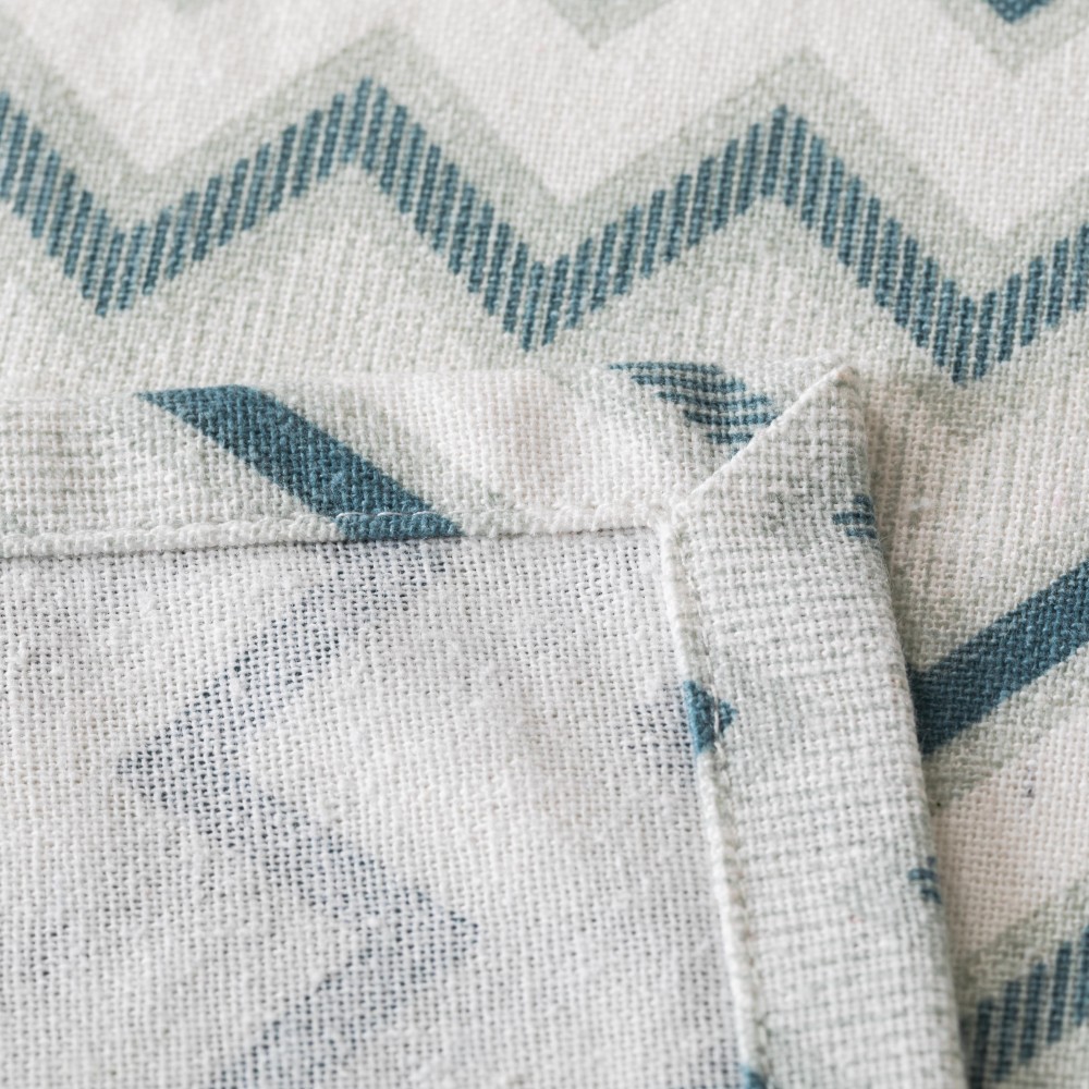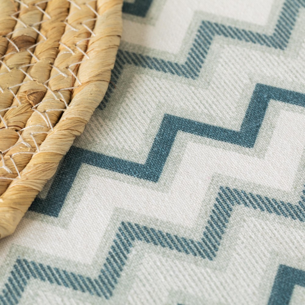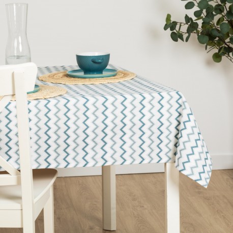 Cuenta con un diseño original y sencillo de zig zag en tonos azules sobre un fondo blanco. El complemento que no puede faltar para dar el toque de elegancia a la vez que dar protección de las posibles salpicaduras.