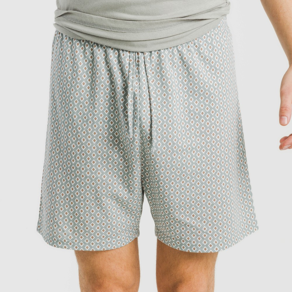 El pijama se conforma de una camiseta lisa de color verde y un pantalón del mismo tono con estampado geométrico de rombos en tonos naranjas y blancos.