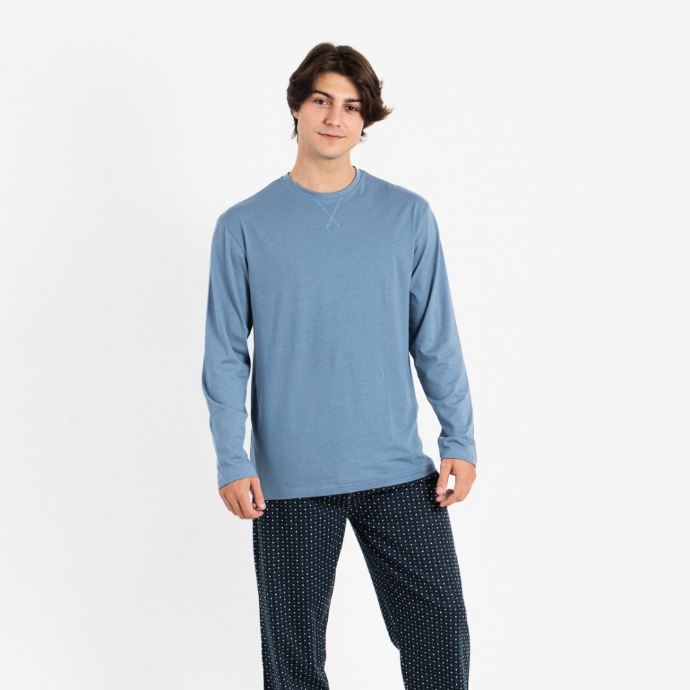 Pijama de hombre compuesto por camiseta manga larga de algodón 100% y pantalón de franela.