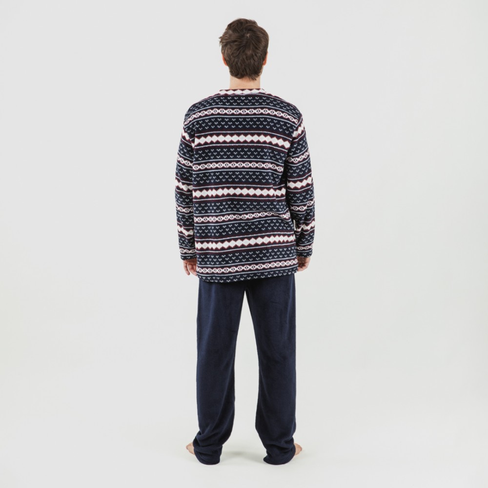 Pijama cómodo con camiseta estampada de series geométricas de rombos en color blanco y burdeos sobre un fondo azul marino y pantalón azul oscuro liso. Tejido extra suave y calentito, ideal para el invierno. Aquí tiene lo que buscaba para estar en casa, elegante y relajado para ir a dormir, con un diseño y un estilo particular, atractivo y confortable.