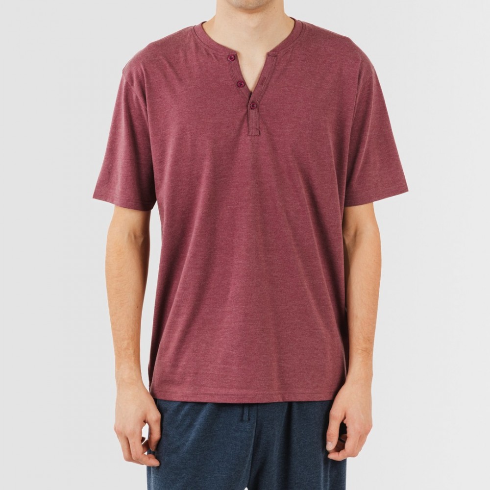 El pijama se conforma de una camiseta lisa de color burdeos con tres botones en la parte del cuello y un pantalón liso en color azul marino. El pantalón del pijama tiene la cintura elástica recubierta con una cinta para ajustar y además cuenta con dos bolsillos en los laterales.