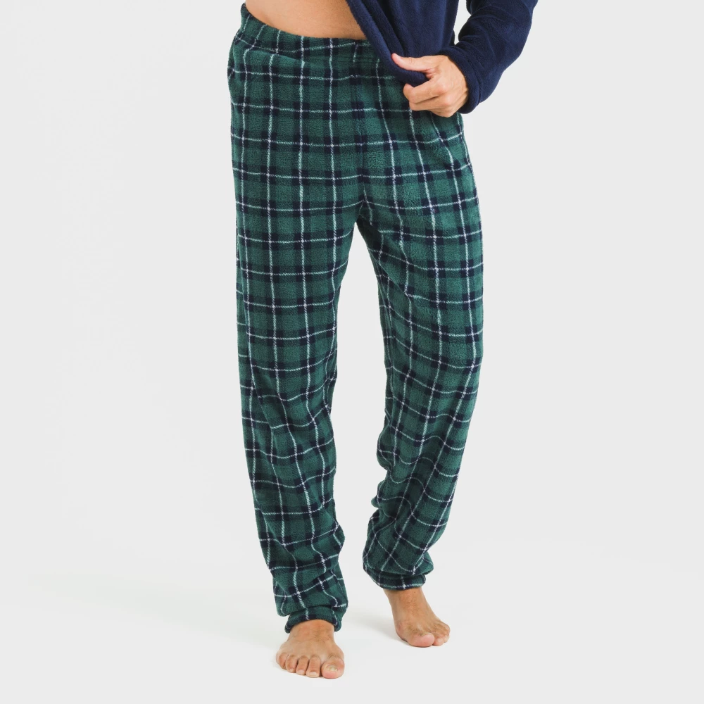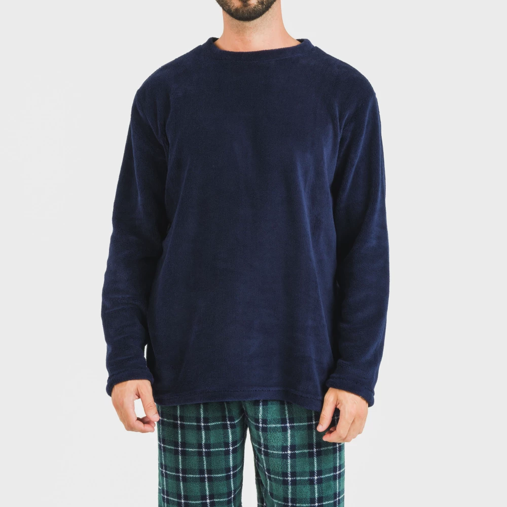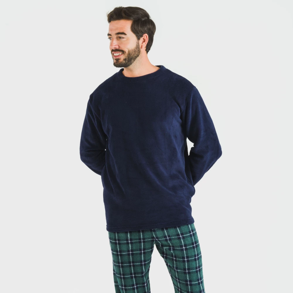 Pijama cómodo con camiseta azul marino lisa y pantalón de cuadros verdes y azules. Tejido extra suave y calentito, ideal para el invierno.